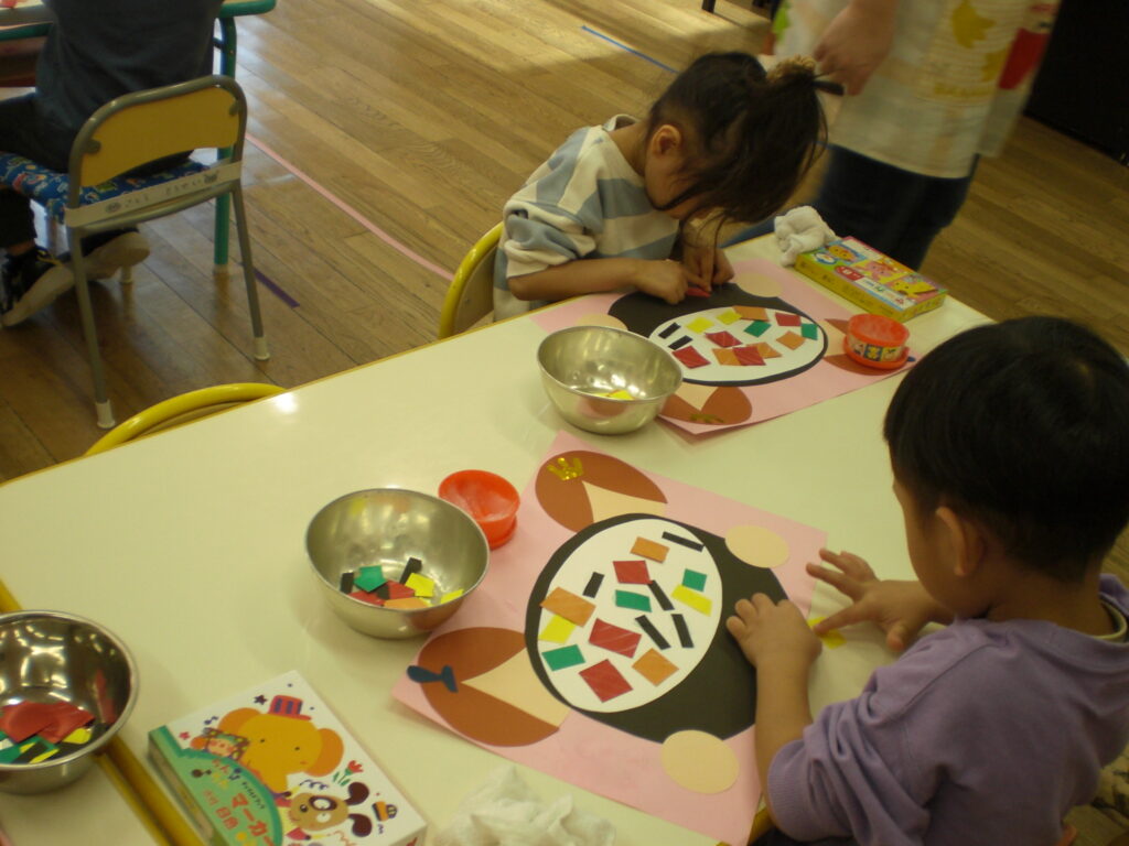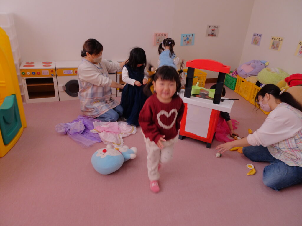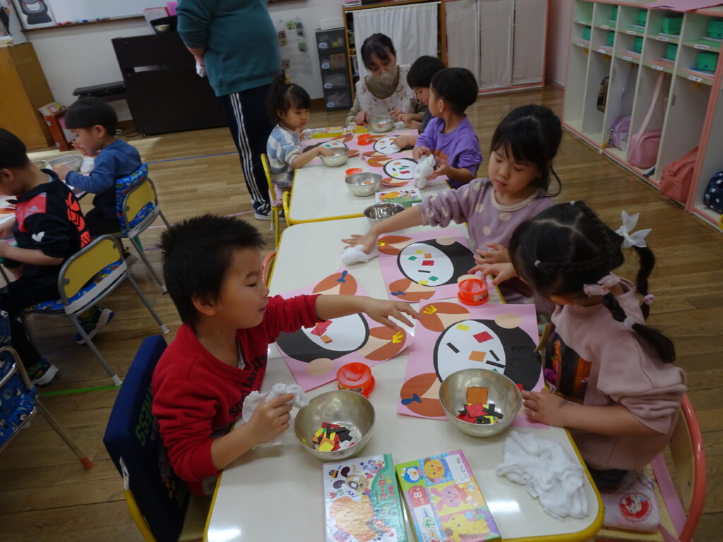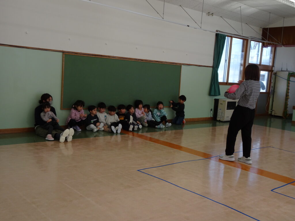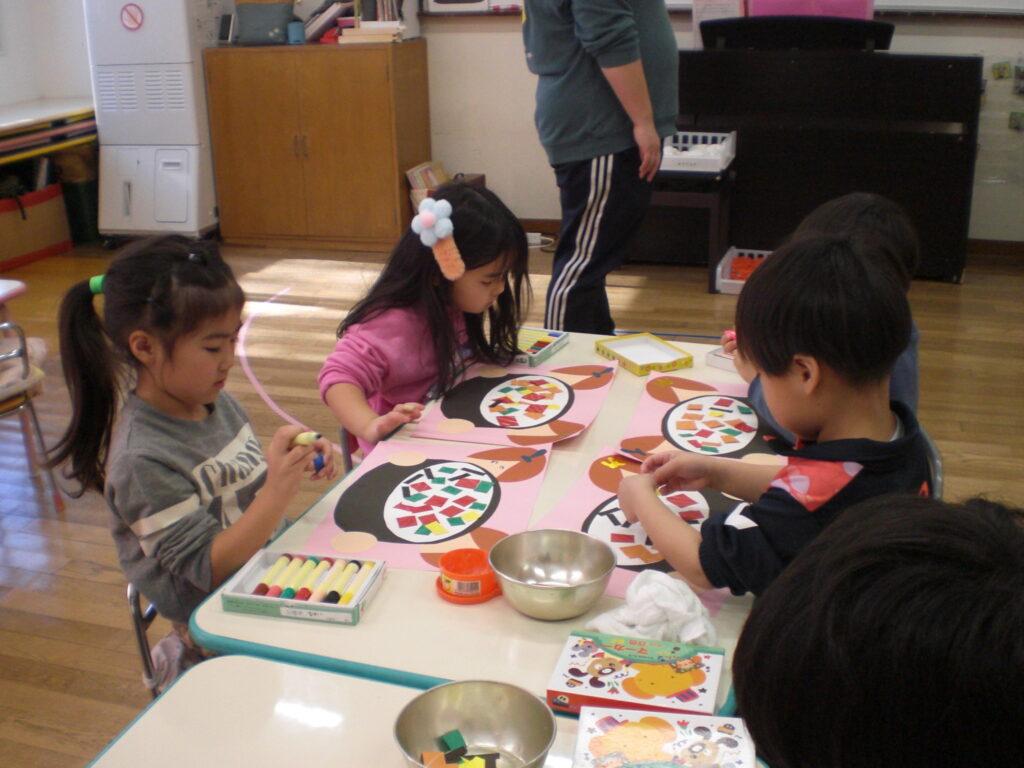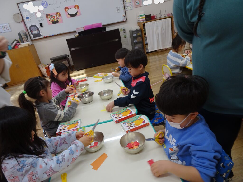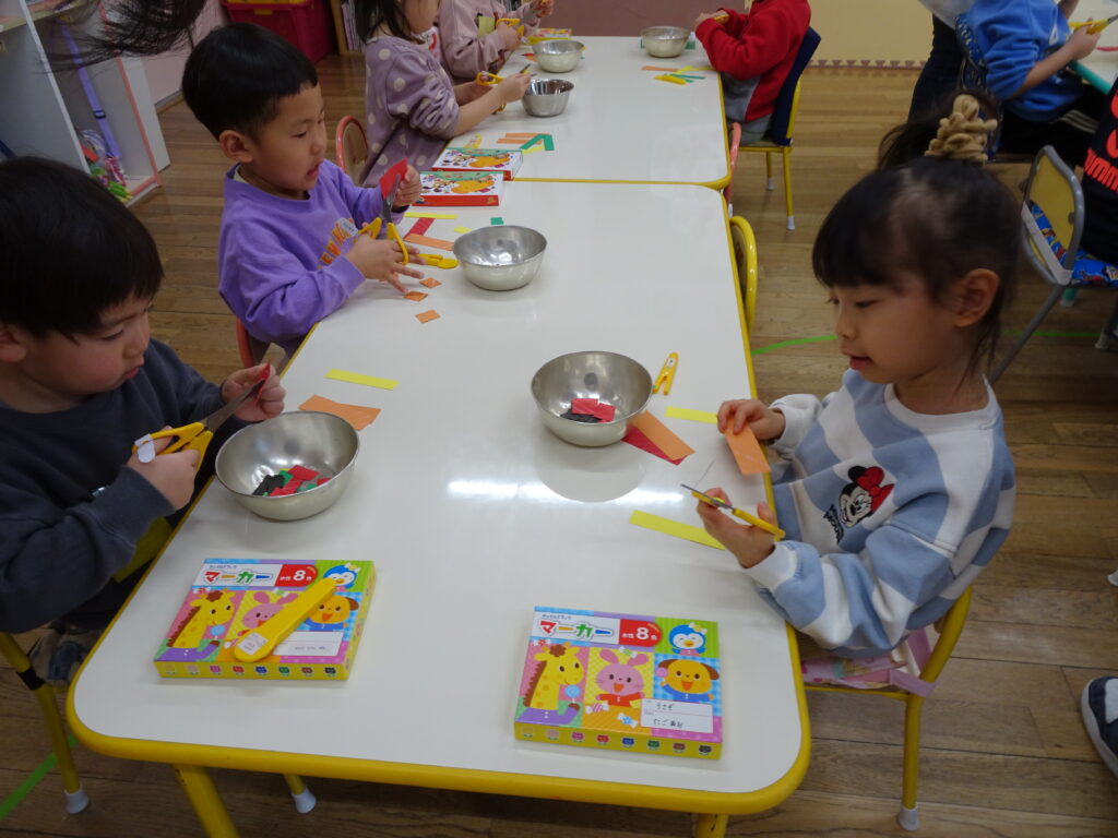 今日きりん組さんは、「クッキング会議」をして、最後のクッキングで何を作りたいのか話し合いました。「フルーツポンチを作りたい。」「カレーがいいな。」「クレープ!」とみんなで話し合い、「フルーツポンチ」に決まりました。みんなで揃って、クッキングができるといいですね。ぱんだ組さんは、お遊戯室で「ボール鬼」「宝とり鬼」をしました。ボールの投げ方も上手になって、ルールのある遊びが楽しめるようにようになったぱんだ組さんです。うさぎ組さんはひな祭り製作で「ちらし寿司」を作りました。はさみで具を切って、糊で貼って、指先の使い方も上手になってきました。お喋りせずに、真剣にハサミを使ううさぎ組さんが素敵でした!カンガルークラブさんはお遊戯隣のピヨピヨのお部屋で遊びました。ドレスを着たり、ままごとをしたり、大きなブロックで遊んだり…、たくさん遊びました。