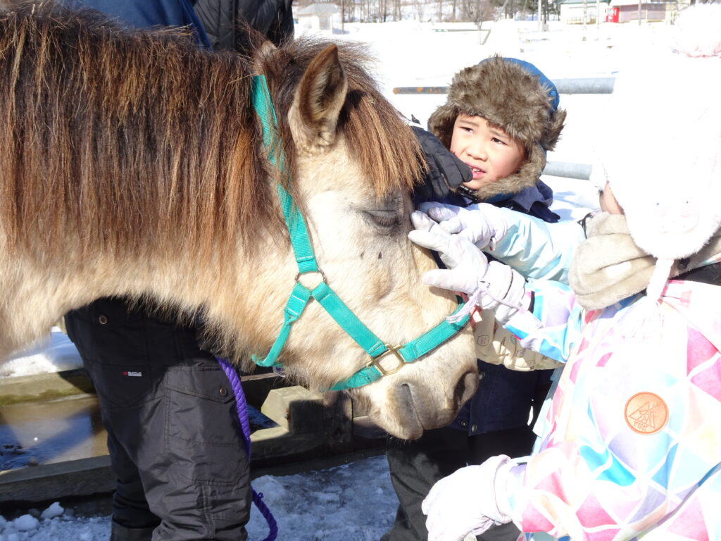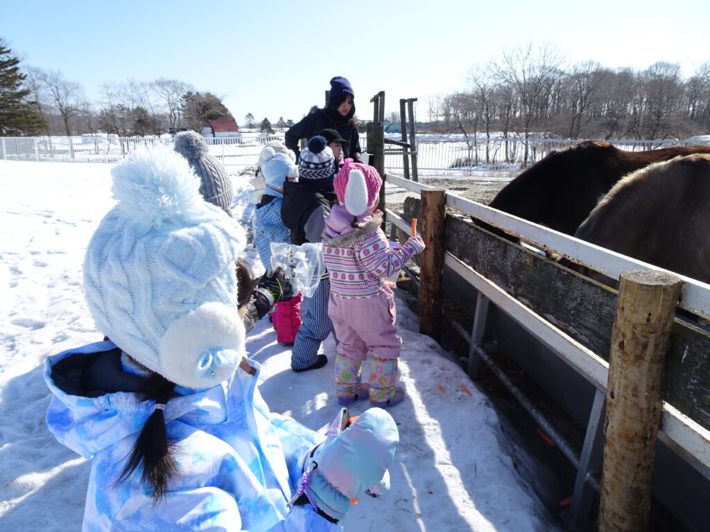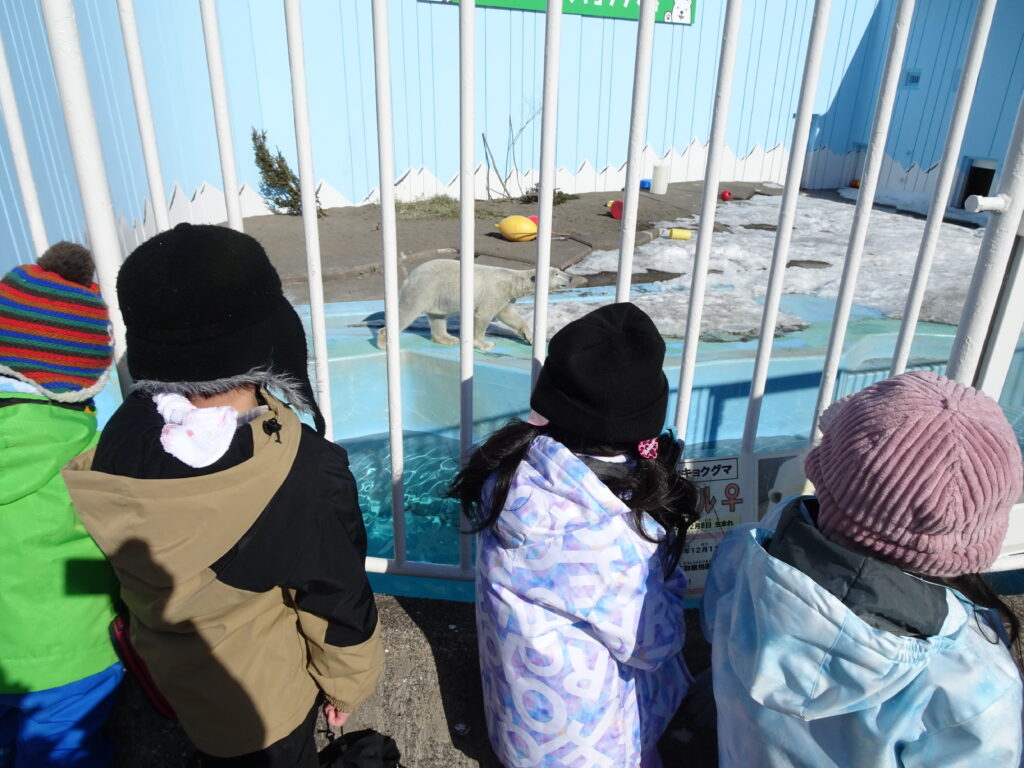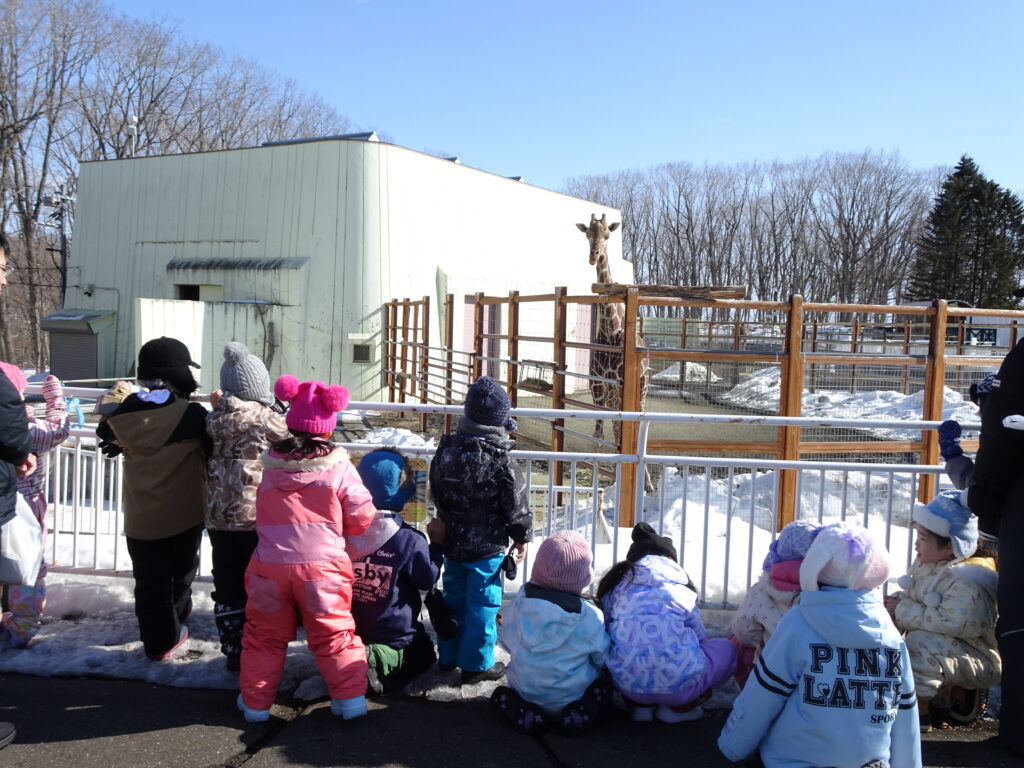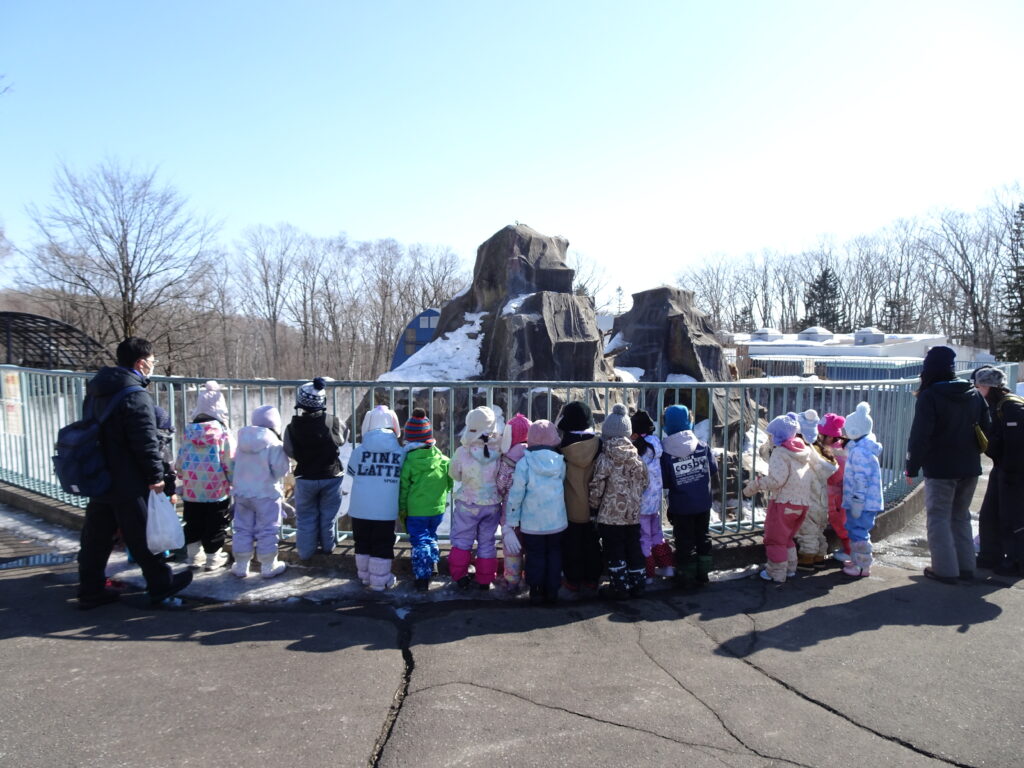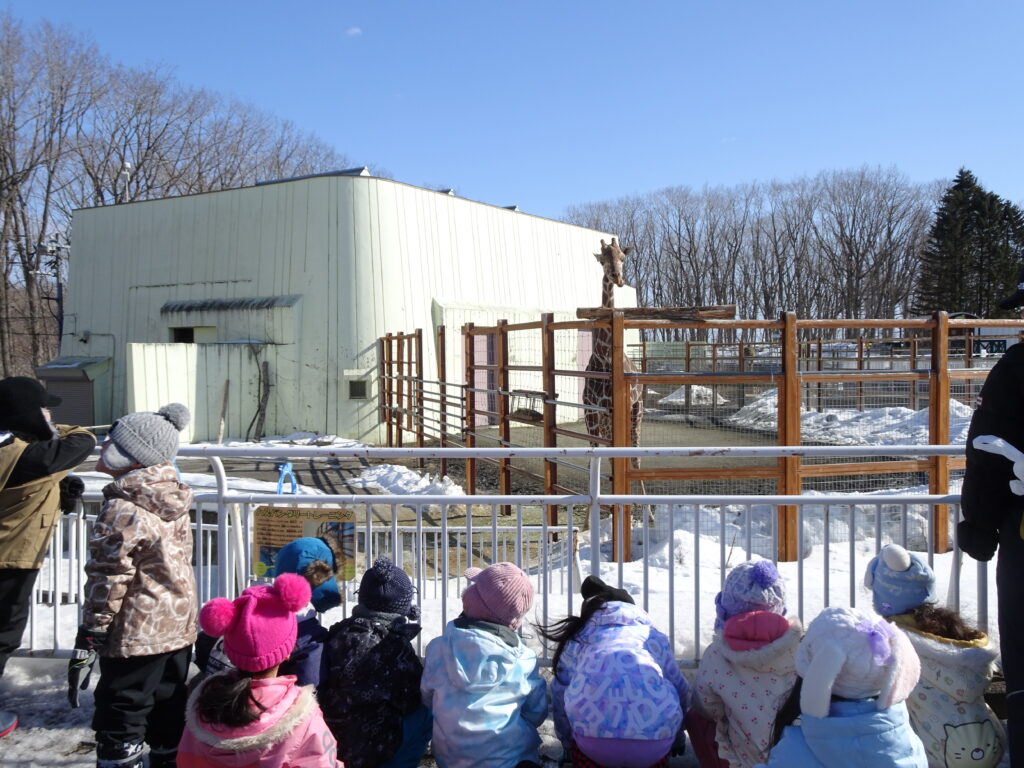 今日きりん組さんは、ホースパークと動物園に行ってきました。ホースパークでは3グループに分かれて、引馬体験、エサやり体験、雪遊びをしました。以前はグループ毎に馬そりに乗っていましたが馬そりは実施できなくなったので、一人ずつ引き馬に乗りました。最初は「怖いから乗らない。」という子がたくさんいたのですが、お友達の乗る楽しそうな姿を見て「やっぱり乗る!」と乗った子もいました。全員は乗れませんでしたが、エサやり(危険なので箱に入れました)も体験しました。ホースパークの後は、動物園に移動してソリをしました。雪が少なくて今年はソリ滑りは出来ていないのですが、動物園で作ったソリコースを楽しく滑りました。ソリを片付けた後は、動物を見ました。猿山や、オタリア、ホッキョックグマ、キリン、ペンギンなどを楽しく見ることができました。「ビーバーはいなくなったよね。」「ココア死んじゃったよね。」「ホッキョクグマのマルルがいたよ。」動物園について詳しい子ども達でした。帰りのバスでは疲れて、もぐもぐおにぎりを食べた子ども達でした。