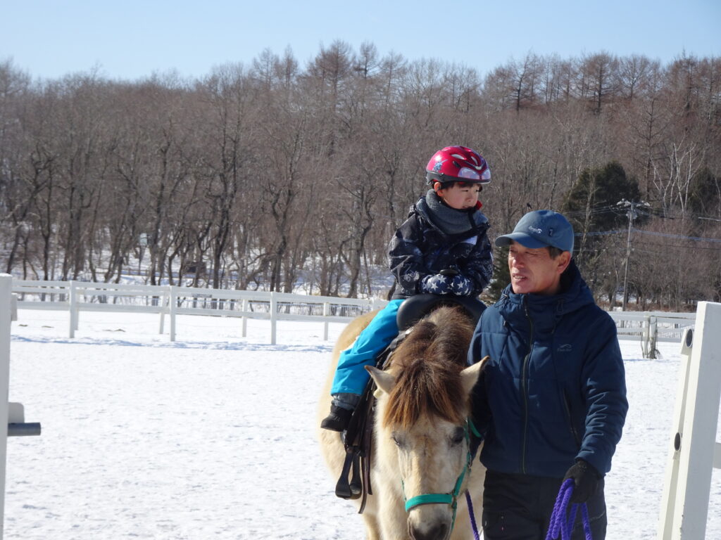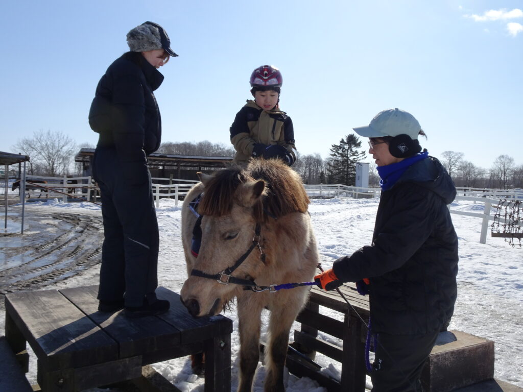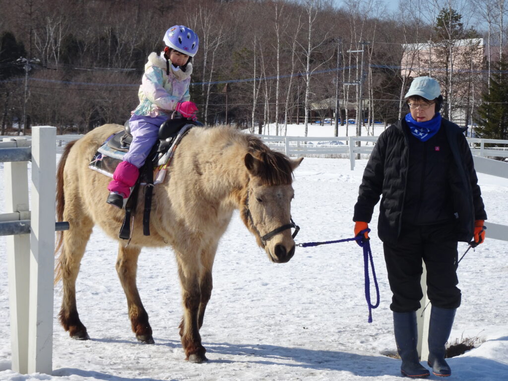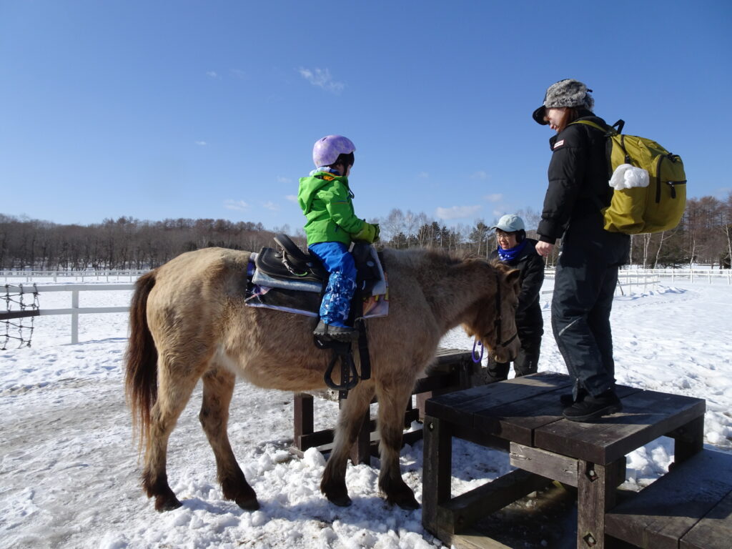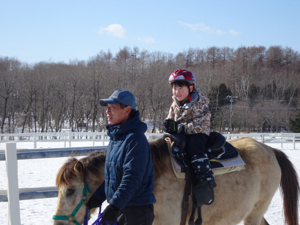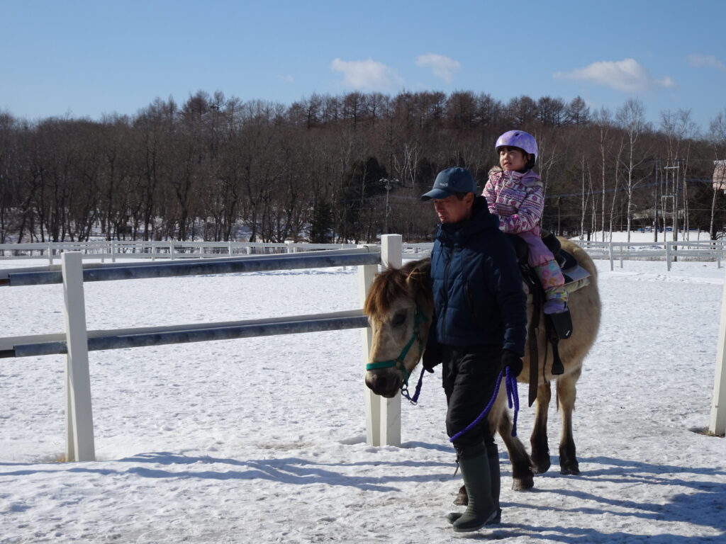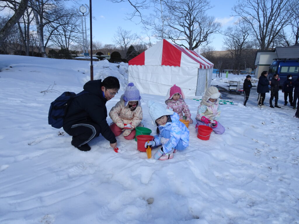 今日きりん組さんは、ホースパークと動物園に行ってきました。ホースパークでは3グループに分かれて、引馬体験、エサやり体験、雪遊びをしました。以前はグループ毎に馬そりに乗っていましたが馬そりは実施できなくなったので、一人ずつ引き馬に乗りました。最初は「怖いから乗らない。」という子がたくさんいたのですが、お友達の乗る楽しそうな姿を見て「やっぱり乗る!」と乗った子もいました。全員は乗れませんでしたが、エサやり(危険なので箱に入れました)も体験しました。ホースパークの後は、動物園に移動してソリをしました。雪が少なくて今年はソリ滑りは出来ていないのですが、動物園で作ったソリコースを楽しく滑りました。ソリを片付けた後は、動物を見ました。猿山や、オタリア、ホッキョックグマ、キリン、ペンギンなどを楽しく見ることができました。「ビーバーはいなくなったよね。」「ココア死んじゃったよね。」「ホッキョクグマのマルルがいたよ。」動物園について詳しい子ども達でした。帰りのバスでは疲れて、もぐもぐおにぎりを食べた子ども達でした。