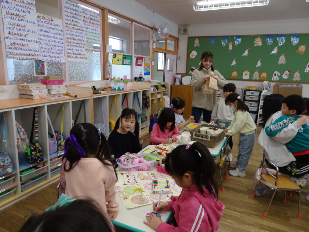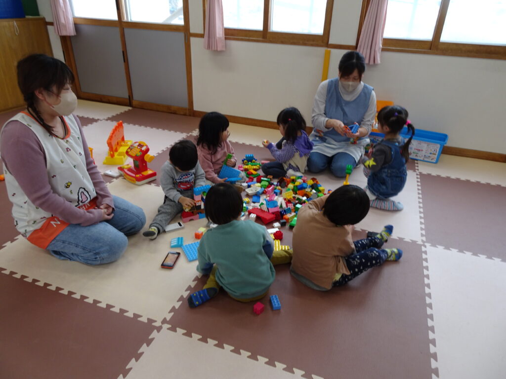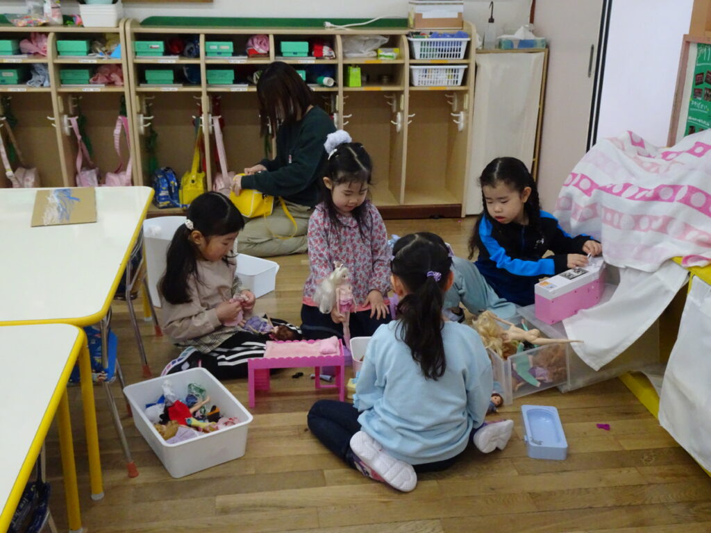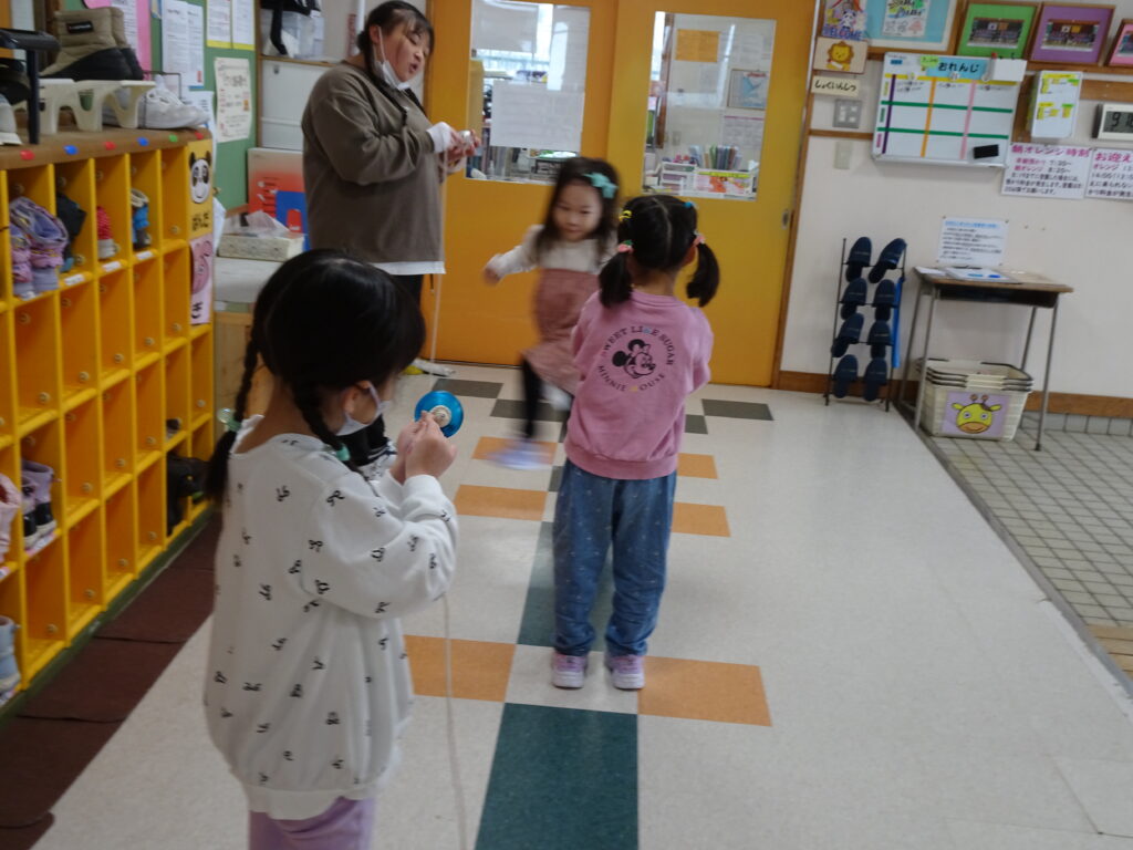 今日は劇団風の子さんの準備の為、朝の自由遊びではお遊戯室が使えなかったので、玄関では「コマ回し」、きりん組さんでは「ドーナツ屋さん」「カードゲーム」、ぱんだ組さんでは「お人形」、うさぎ組さんでは「工作」「おままごと」「自動車」、カンガルークラブさんでは「ブロック」等で楽しく過ごしていました。(森)
