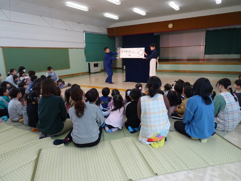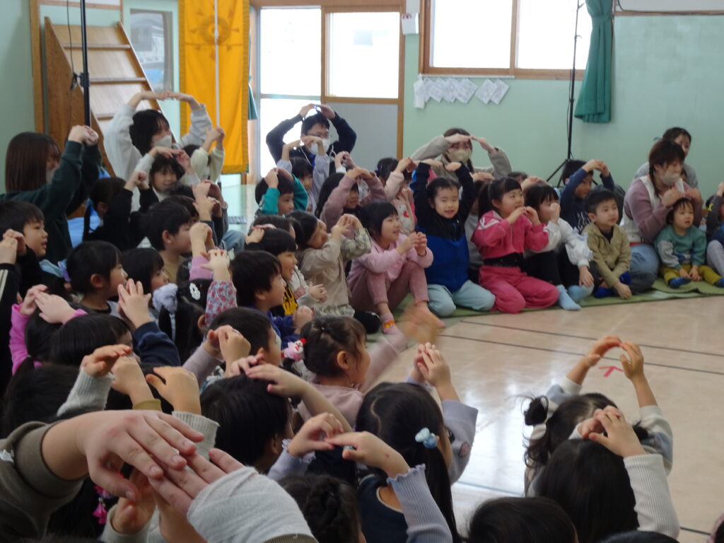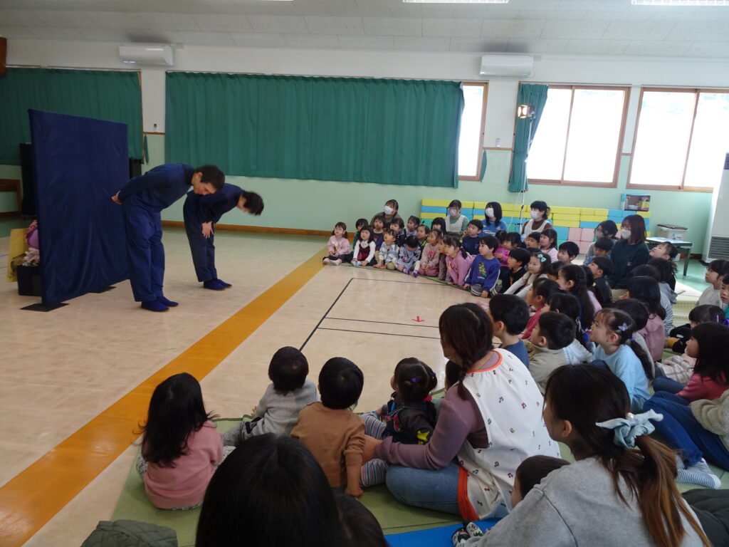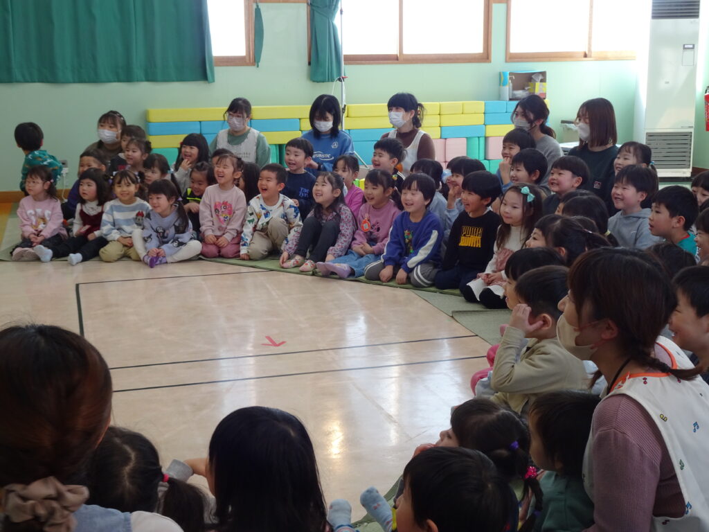今日は劇団風の子北海道の観劇、「いってかえって おひさまのした」がありました。カンガルークラブさんも、さくらんぼクラブさんも一緒に参加しました。手あそび、紙あそびの後には、ペープサートの「おはよう たっちゃん」、スラブ民話の「ババヤガーの白い鳥」を見ました。一緒に手遊びをしたり、歌ったり、笑ったりして、楽しい時間を過ごしました。