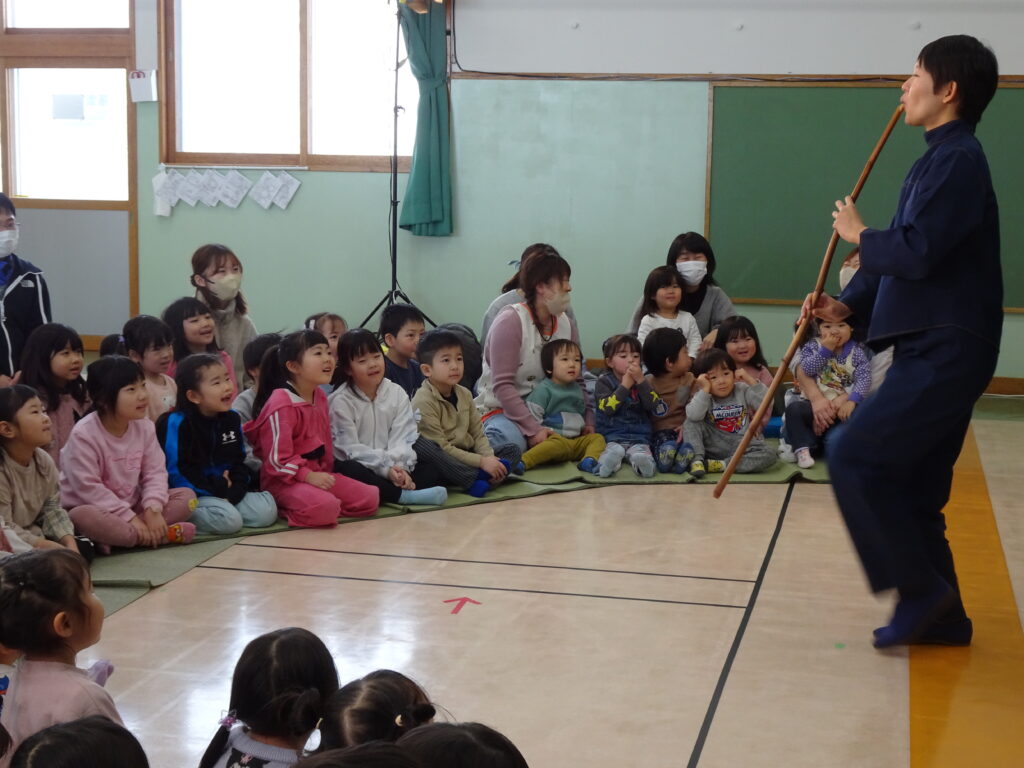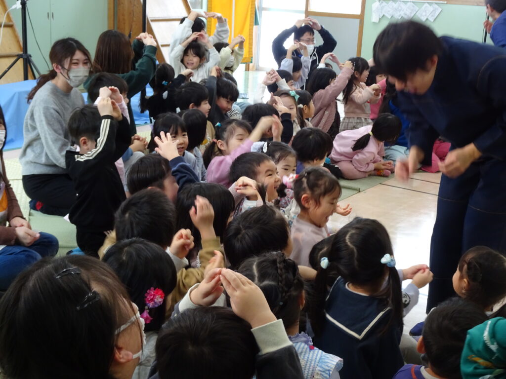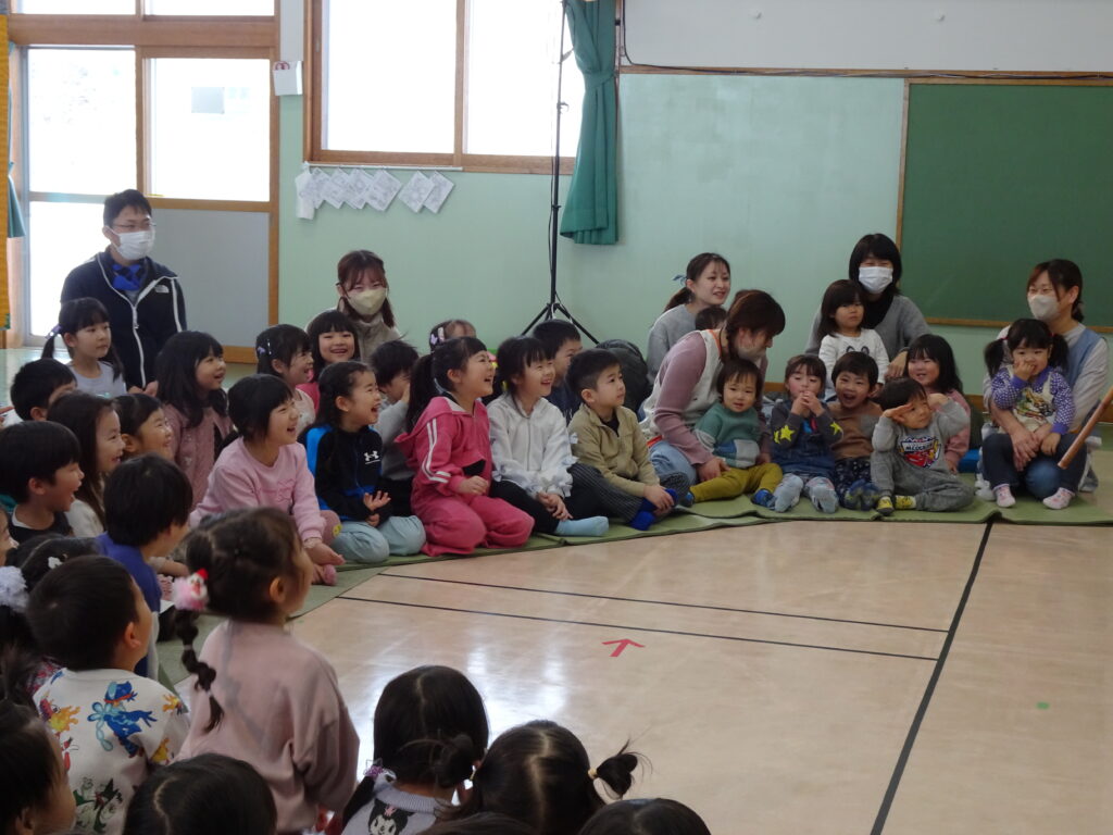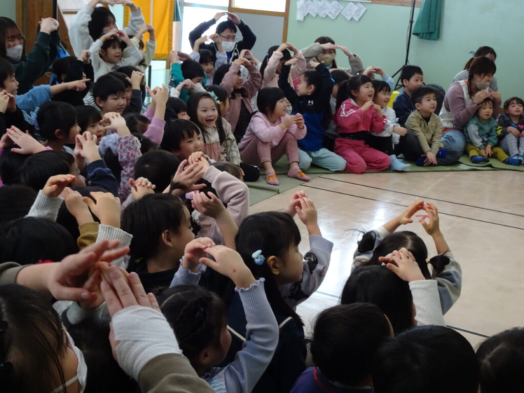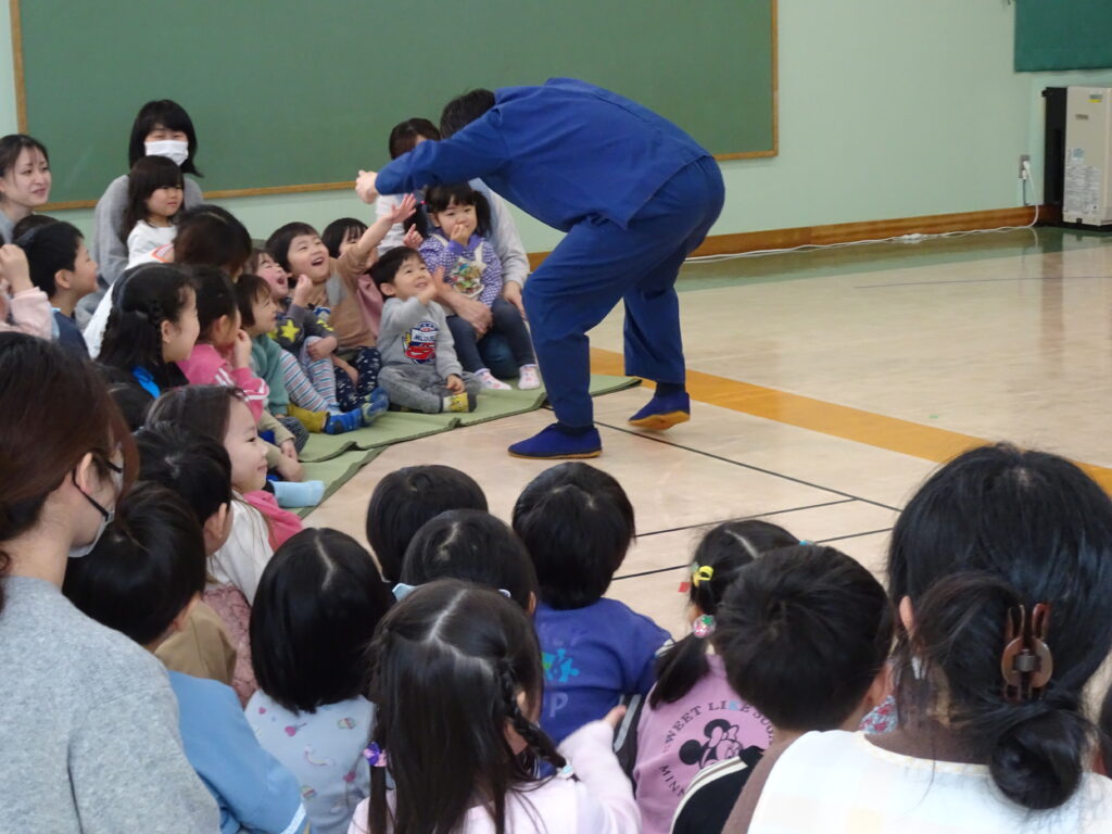 今日は劇団風の子北海道の観劇、「いってかえって おひさまのした」がありました。カンガルークラブさんも、さくらんぼクラブさんも一緒に参加しました。手あそび、紙あそびの後には、ペープサートの「おはよう たっちゃん」、スラブ民話の「ババヤガーの白い鳥」を見ました。一緒に手遊びをしたり、歌ったり、笑ったりして、楽しい時間を過ごしました。