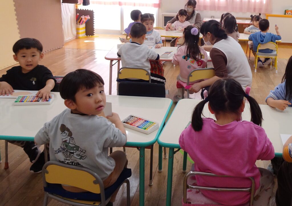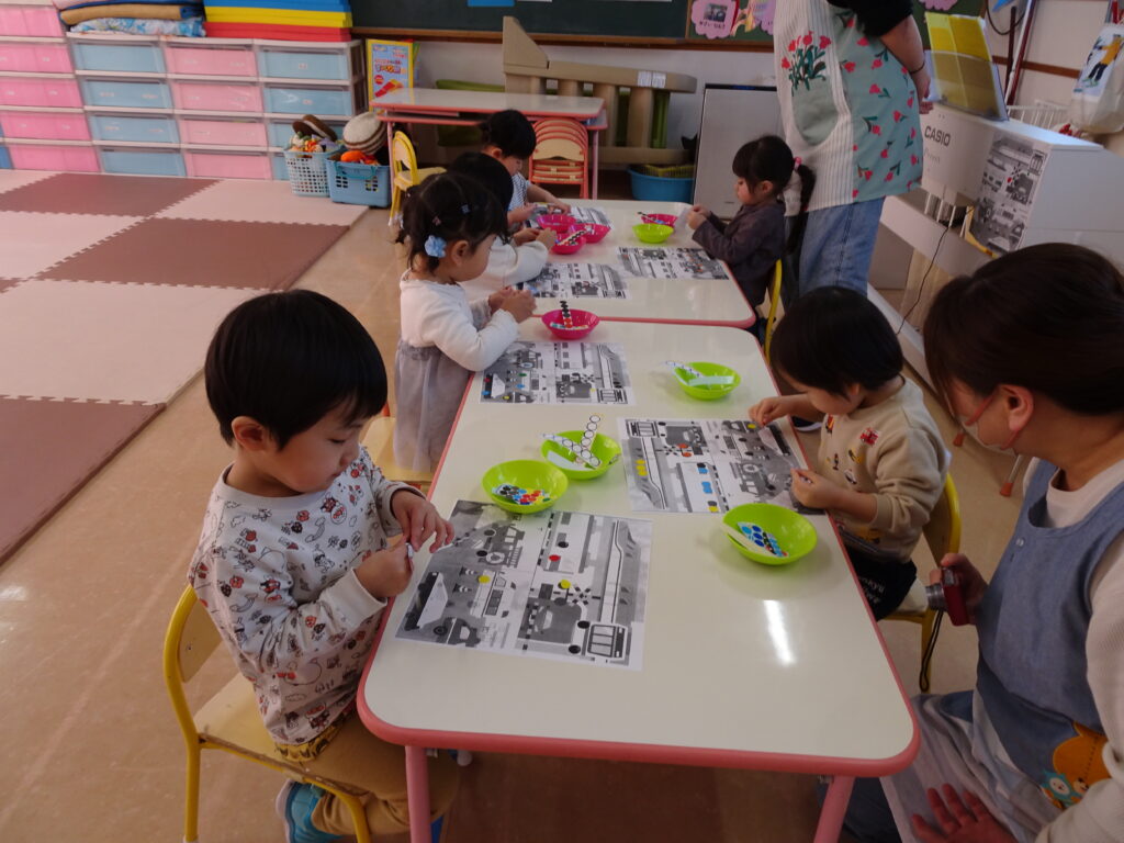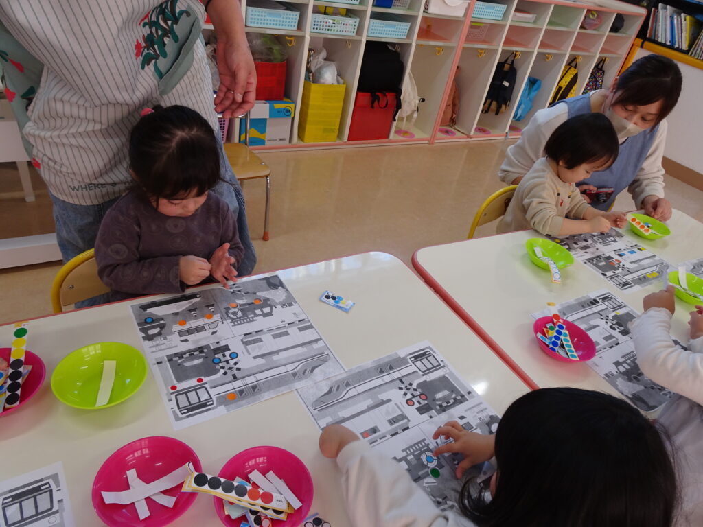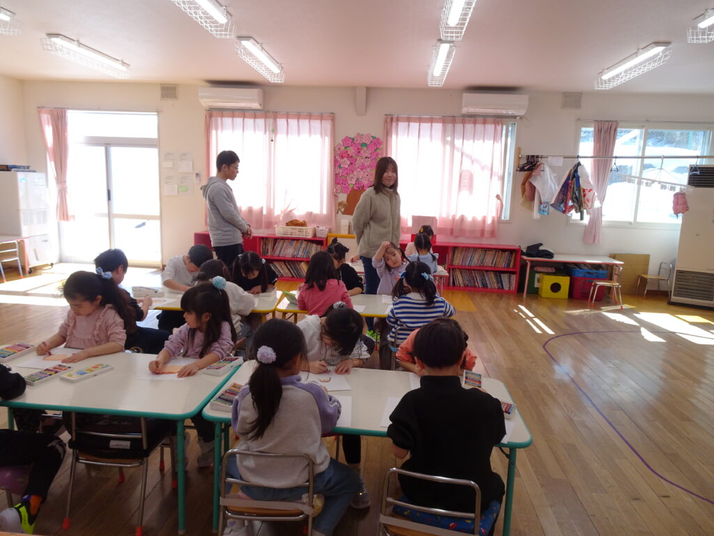 今日きりん組さんとうさぎ組さんは、「プレゼント作り」をしていました。秘密…?のようでした。ぱんだ組さんは、お遊戯室で「バナナ鬼」と「手つなぎ鬼」をしました。ルールも理解して、鬼ごっこを楽しんでいました。カンガルークラブさんは「シールあそび」をしていました。前回より難しくて、いろいろな大きさのシール貼りに挑戦していました。