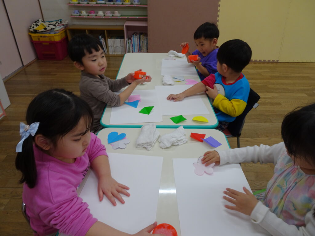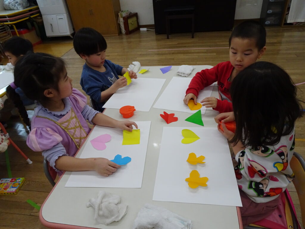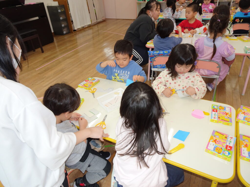 先週の土曜日14日に第61回卒園式が無事に終了し、20名のきりん組さんが巣立っていきました。きりん組さんは、今日から預かり保育の利用者のみの登園となりました。今日は7名の登園でした。お部屋で折り紙やアイロンビーズをして遊んだり、ぱんだ組さんと一緒に短大の体育館に行って遊んだりしました。ぱんだ組さんはきりん組さんと鬼ごっこ、ボールや体操リング、テントなどでたくさん遊んで、楽しんできました。うさぎ組さんはハサミの練習で「切り紙の練習」をしました。ハート、丸、四角、三角…、いろいろな形を切ってノリで台紙に貼り付けました。ハサミの使い方も上手になったうさぎ組さんでした。カンガルークラブさんは「動物園ごっこ」の2回目をしました。バスに乗って出かけて、ウサギ、ワニ、ヤギ、ティラノザウルス…、動物を見たり、「もぐもぐタイム」でエサをあげたり、動物園を楽しみました。ごっこ遊びを楽しめるようになったカンガルーさんです。