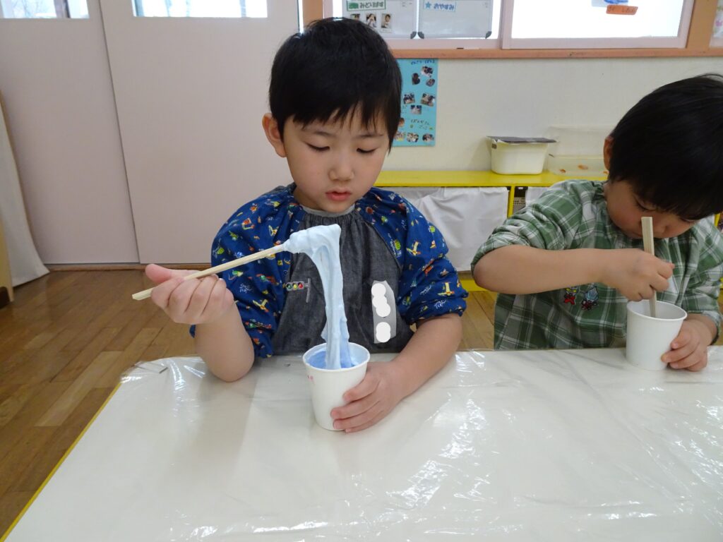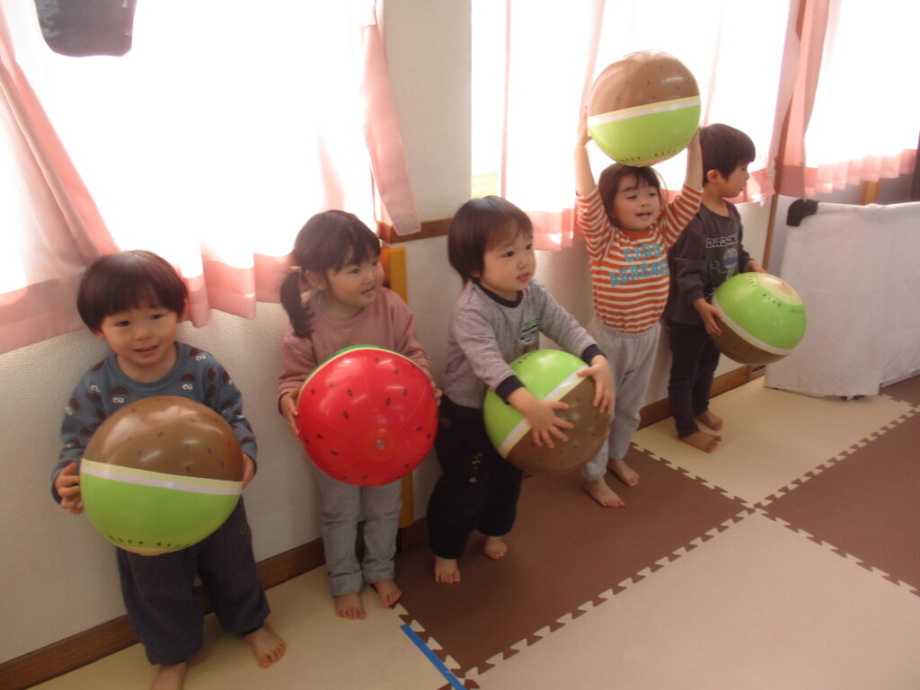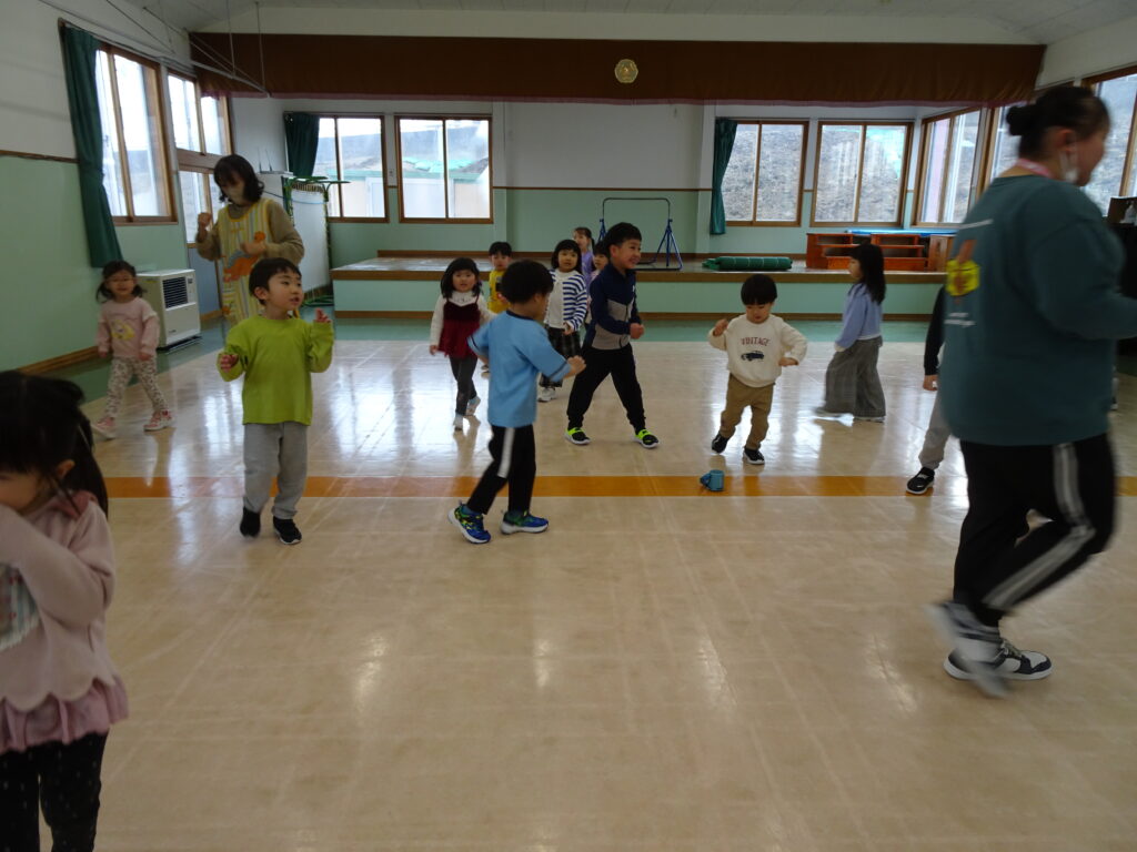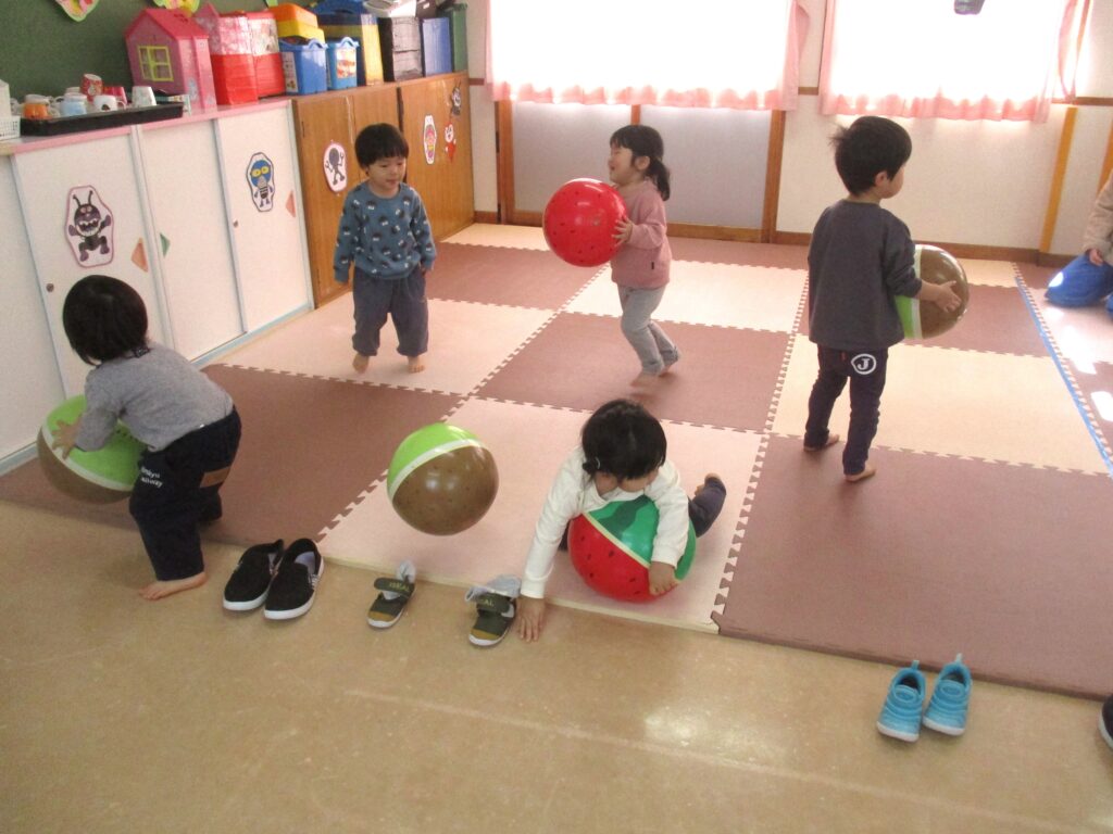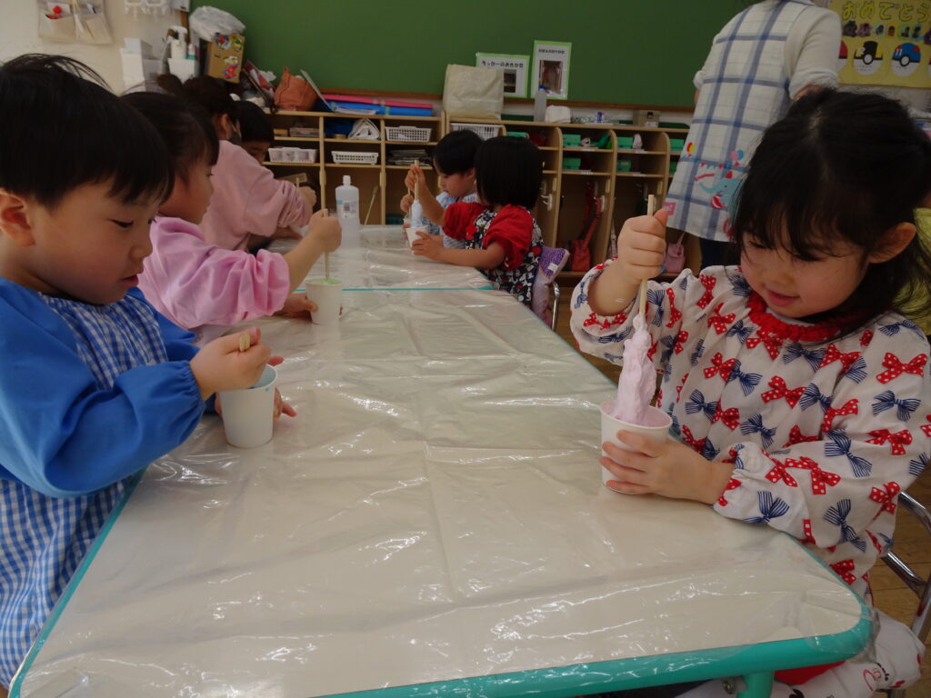 園庭は例年よりも雪が溶けるのも、乾くのも早くて、運転手さんやたかひろ先生が丁寧に均してくれています。きれいになって来た園庭で、今日きりん組のあずかりさんは少し遊びました。朝のうさぎ組では「箱の中身当てゲーム」をしていました。箱の中には、お部屋のおもちゃが入っていました。お遊戯室では、うさぎ組さんときりん組の預かりさんが一緒に集団遊び「ストップゲーム」「ハイハイ鬼ごっこ」「電子レンジ鬼ごっこ」等を楽しみました。ハイハイするのも、とっても早かったです。ぱんだ組さんは、お部屋でスライムを作りました。紙コップの中に洗濯ノリや魔法の水を入れて、シェービングフォームやキラキラのスパンコールも入れてこねこねして楽しく遊びました。カンガルークラブさんは、お部屋でボールで遊びました。ボールをポンポン投げたり受けたり、バイキンマンもやっつけたりしました。朝の会ではラジオ体操もやっていましたよ。(森)