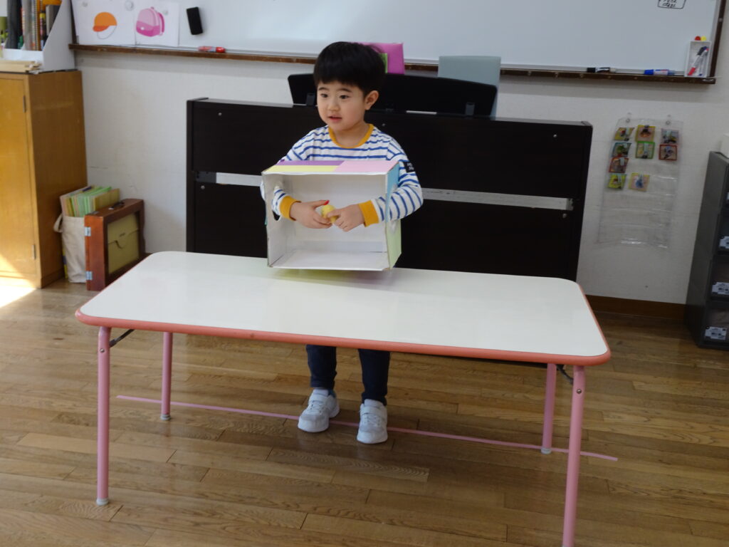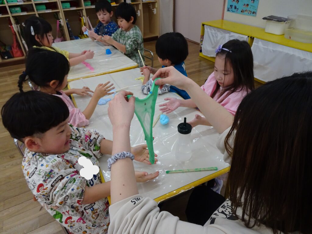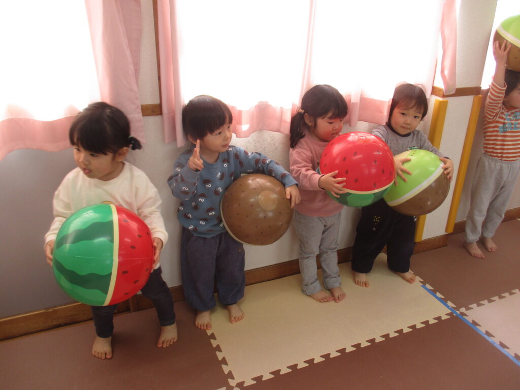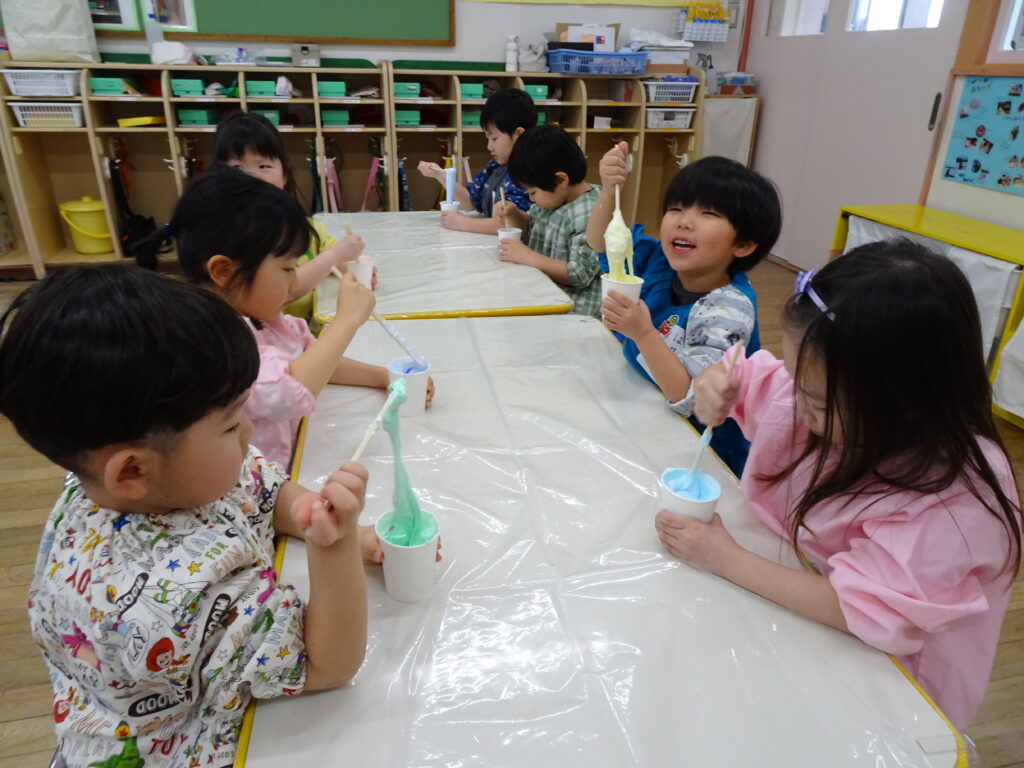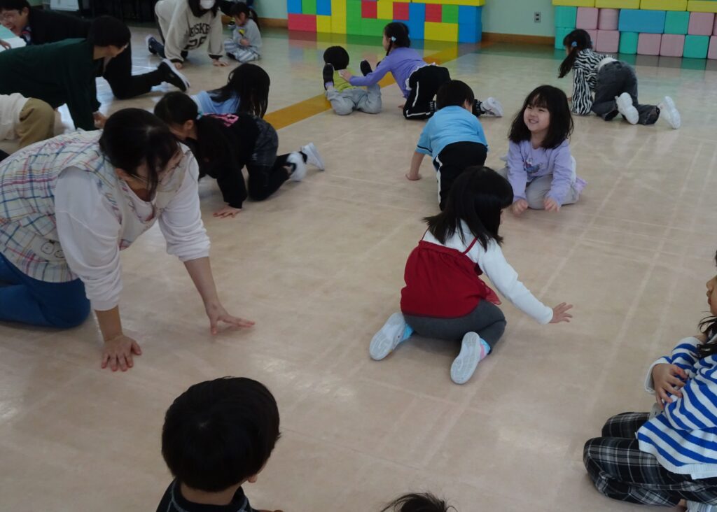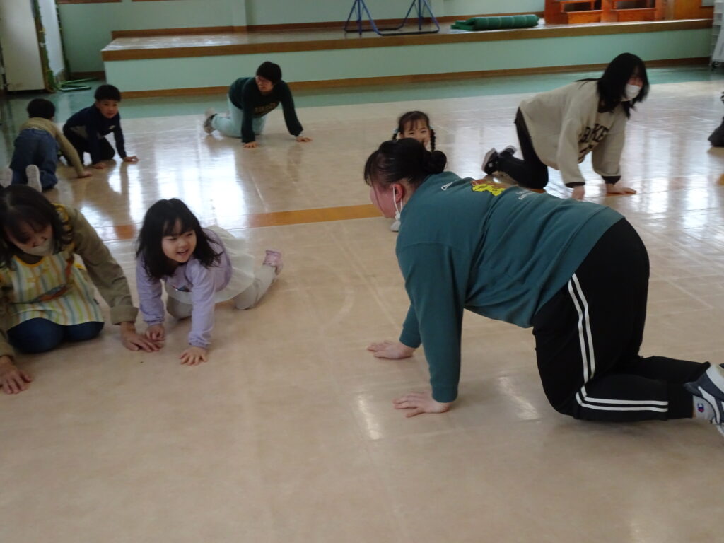 園庭は例年よりも雪が溶けるのも、乾くのも早くて、運転手さんやたかひろ先生が丁寧に均してくれています。きれいになって来た園庭で、今日きりん組のあずかりさんは少し遊びました。朝のうさぎ組では「箱の中身当てゲーム」をしていました。箱の中には、お部屋のおもちゃが入っていました。お遊戯室では、うさぎ組さんときりん組の預かりさんが一緒に集団遊び「ストップゲーム」「ハイハイ鬼ごっこ」「電子レンジ鬼ごっこ」等を楽しみました。ハイハイするのも、とっても早かったです。ぱんだ組さんは、お部屋でスライムを作りました。紙コップの中に洗濯ノリや魔法の水を入れて、シェービングフォームやキラキラのスパンコールも入れてこねこねして楽しく遊びました。カンガルークラブさんは、お部屋でボールで遊びました。ボールをポンポン投げたり受けたり、バイキンマンもやっつけたりしました。朝の会ではラジオ体操もやっていましたよ。(森)