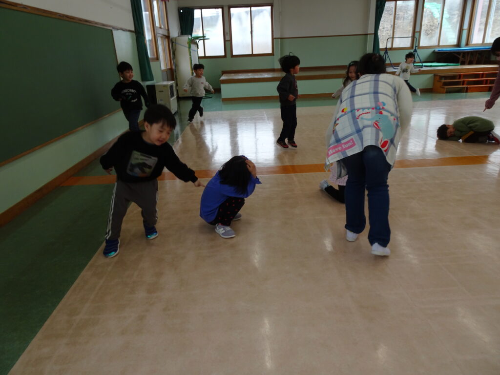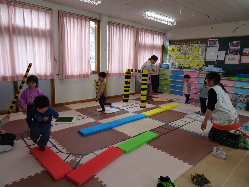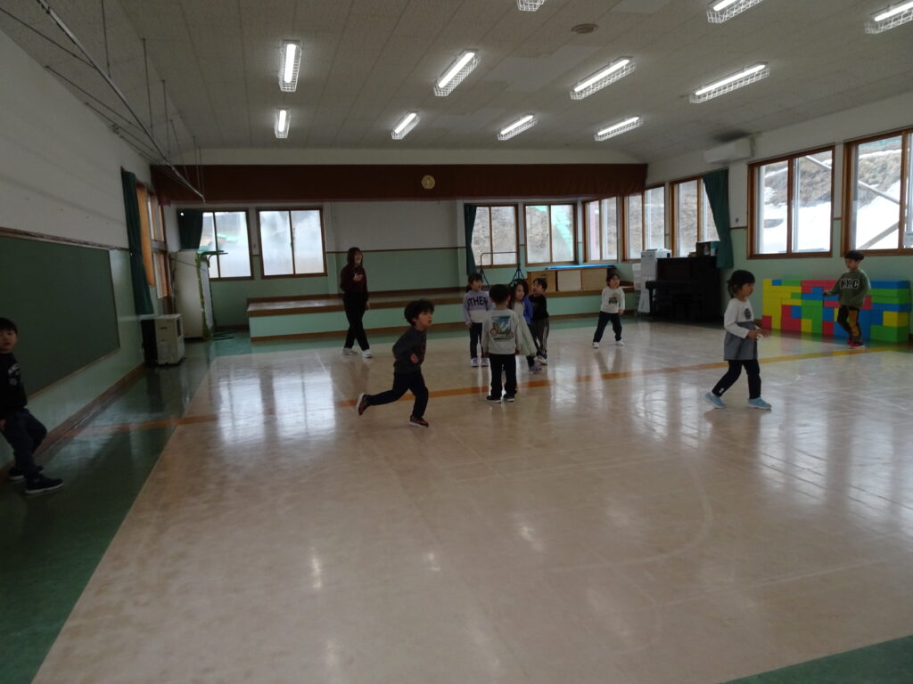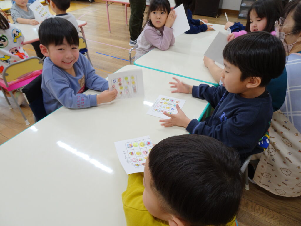 今日は寒くて、雪もちらつくお天気でした。きりん組さんの預かり保育利用の子達は、アイロンビーズをしたり、塗り絵をしたり、うなり笛を作ったりして楽しんでいました。ぱんだ組さんはお遊戯室で「ダンゴムシおにごっこ」とアメリカンドッジボールをしました。ダンゴムシの姿が可愛くて、アメリカンドッジボールもルールを守って楽しんでいました。成長しました!うさぎ組さんはビンゴ大会をしました。先生手作りの賞品に始まる前から「剣が欲しい。」「マントが欲しい。」と言っていました。ビンゴカードはシールを貼り付けて、ホワイトボードに映し出されたシールと同じシールに〇を付けました。1番の子はマイク、2番の子は剣を選んでいました。皆でビンゴを楽しみました。カンガルークラブさんは「サーキット遊び」をしました。ボコボコやザラザラ、ふわふわのマットの上を歩いたり、トンネルや踏切を通りました。最後にドクターイエローに乗って楽しんだカンガルーさんでした。