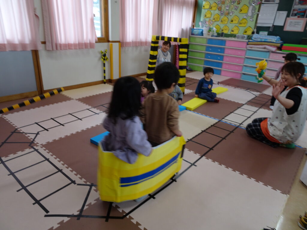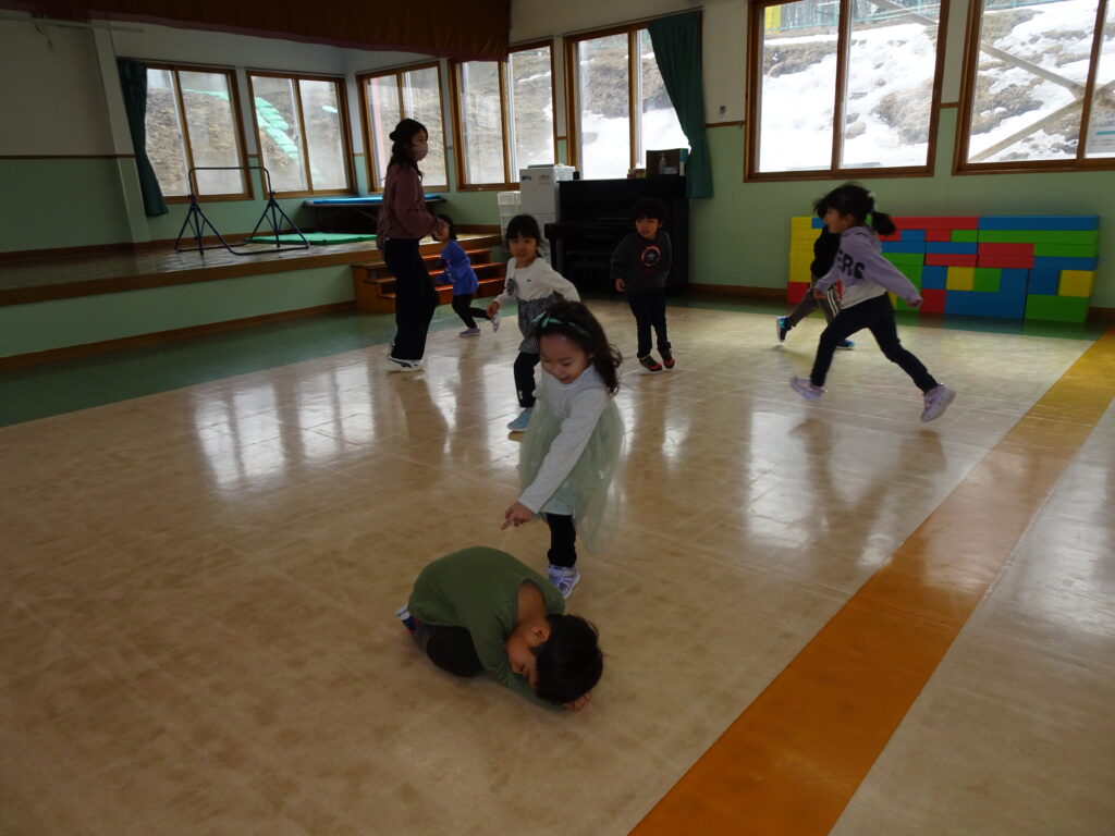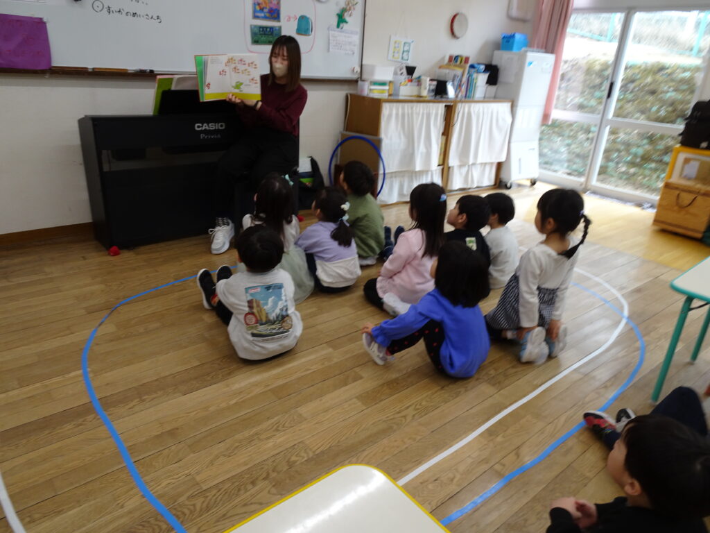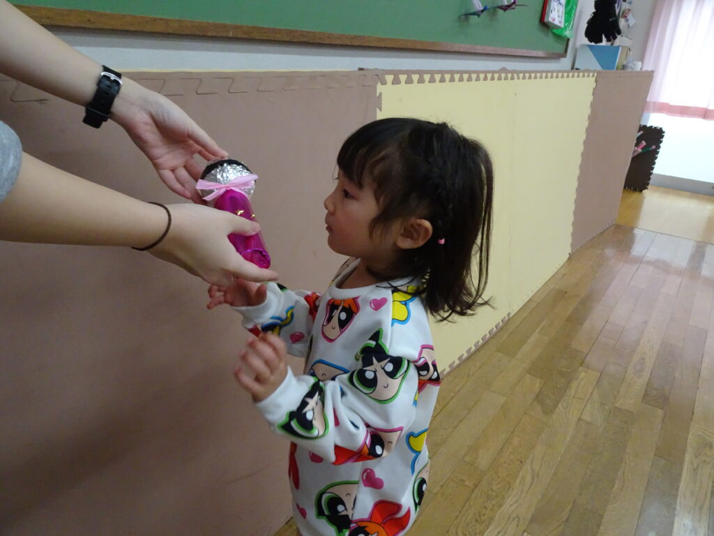 今日は寒くて、雪もちらつくお天気でした。きりん組さんの預かり保育利用の子達は、アイロンビーズをしたり、塗り絵をしたり、うなり笛を作ったりして楽しんでいました。ぱんだ組さんはお遊戯室で「ダンゴムシおにごっこ」とアメリカンドッジボールをしました。ダンゴムシの姿が可愛くて、アメリカンドッジボールもルールを守って楽しんでいました。成長しました!うさぎ組さんはビンゴ大会をしました。先生手作りの賞品に始まる前から「剣が欲しい。」「マントが欲しい。」と言っていました。ビンゴカードはシールを貼り付けて、ホワイトボードに映し出されたシールと同じシールに〇を付けました。1番の子はマイク、2番の子は剣を選んでいました。皆でビンゴを楽しみました。カンガルークラブさんは「サーキット遊び」をしました。ボコボコやザラザラ、ふわふわのマットの上を歩いたり、トンネルや踏切を通りました。最後にドクターイエローに乗って楽しんだカンガルーさんでした。