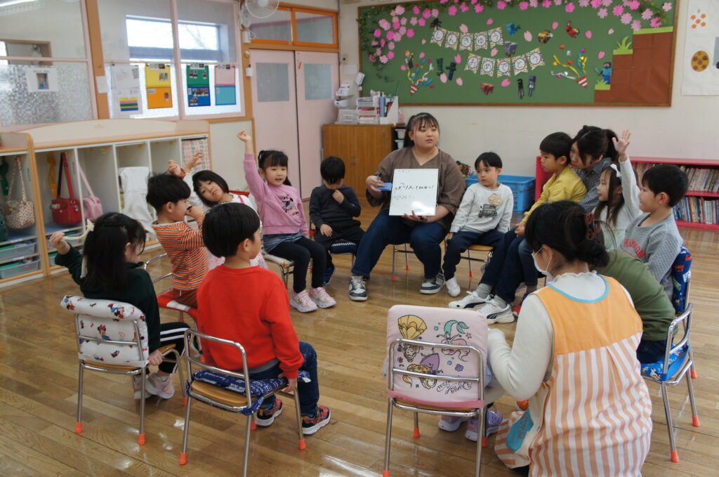 きりん組さんは、「子ども会議」を行い会議名と今後の保育で何をしたいかを話し合っていました。