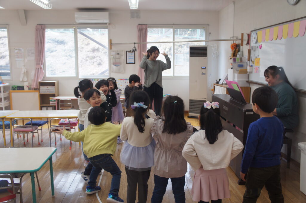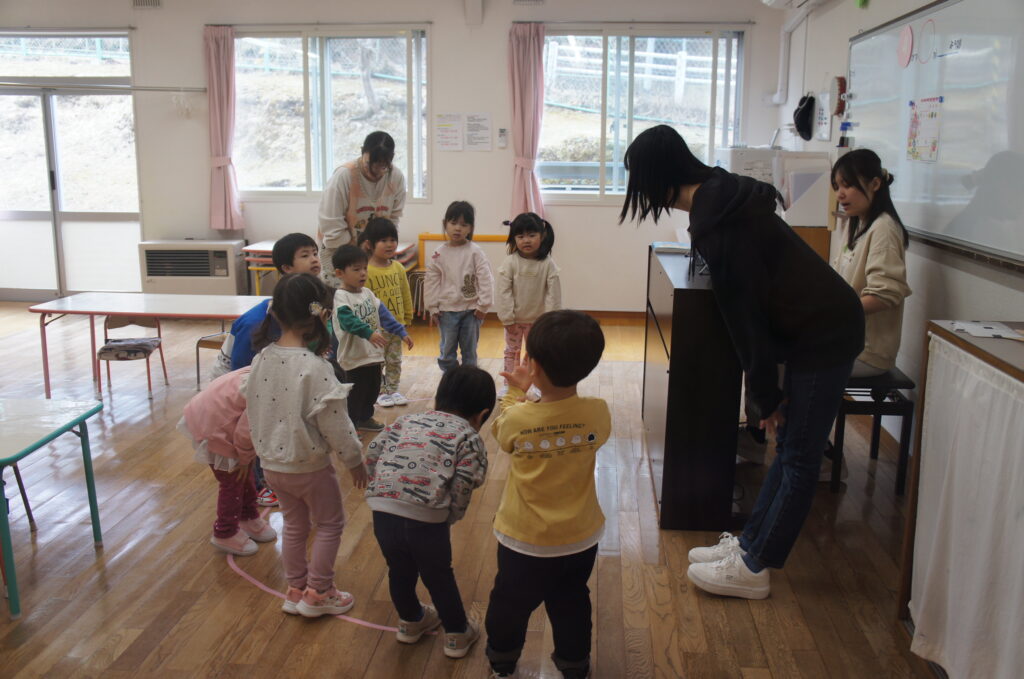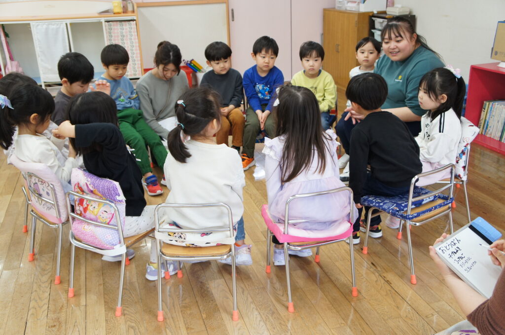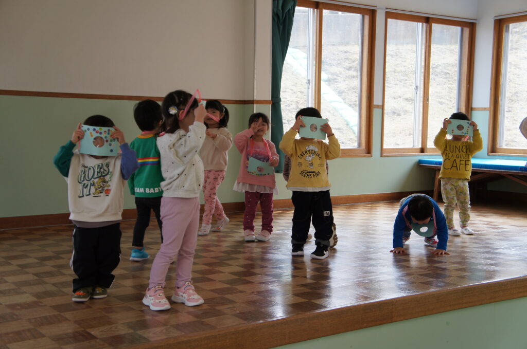 今日のお楽しみ(設定保育)できりん組さんは、係とお当番の話し合いをしました。誰がどんなお当番や係がしたいかを子どもたち同士で話し合って決めていました。自分たちで意見を出し合う姿や気持ちに折り合いを付けられる様子が見られ、成長を感じました。ぱんだ組さんは、園外探索を行いました。道具の使い方を確認した後、園庭で楽しく遊びました。うさぎさんの頃には難しかった力のいる遊具や集中力のいる遊びも楽しめるようになりました。うさぎ組さんは、カメラを持って幼稚園探検をしました。入園式の時は緊張した様子でしたが、今日は楽しそうに「パシャパシャ」と写真を撮っていました。カンガルークラブさんは、トンネル遊びをしました。1回目はバイキンマン、2回目は銀紙で作られた宝石を探してトンネルの中を探検していました。特に2回目の宝石を手に入れた際にとても嬉しそうにしていました。まだまだ肌寒い風が吹いています。お子様だけでなく保護者の皆様も体調を崩さぬようご自愛ください。