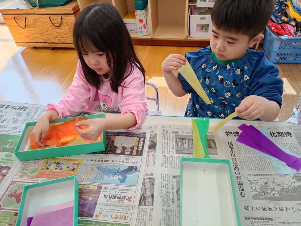 ぱんだ組さんは、こいのぼり製作をしました。こいのぼりの台紙にのりでお花紙と目を付けたら完成です。久しぶりにのりを作った製作でしたがとても上手でした。