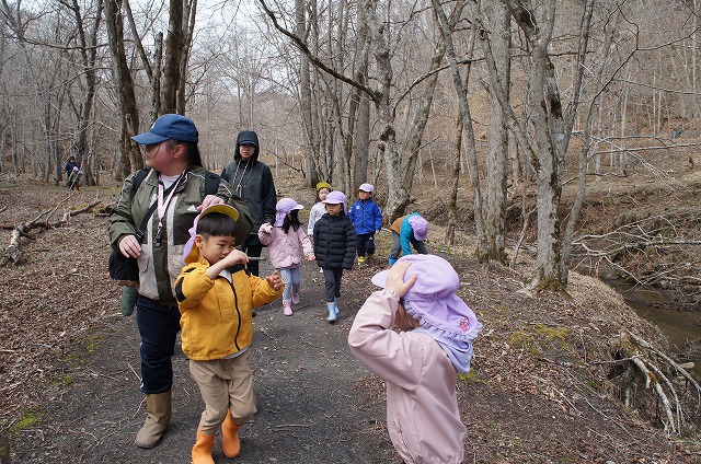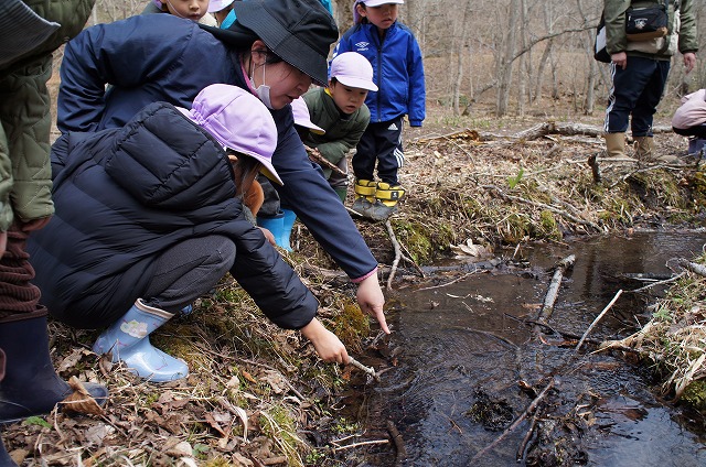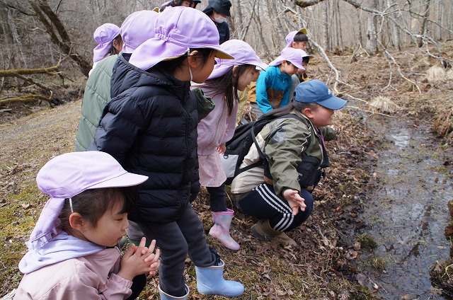 今日のお楽しみできりん組さんは、別保森林公園へ探検に行きました。カエルやカエルの卵を見つけたり、倒木の上に乗っかるなどとても楽しそうでした。