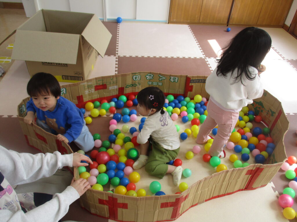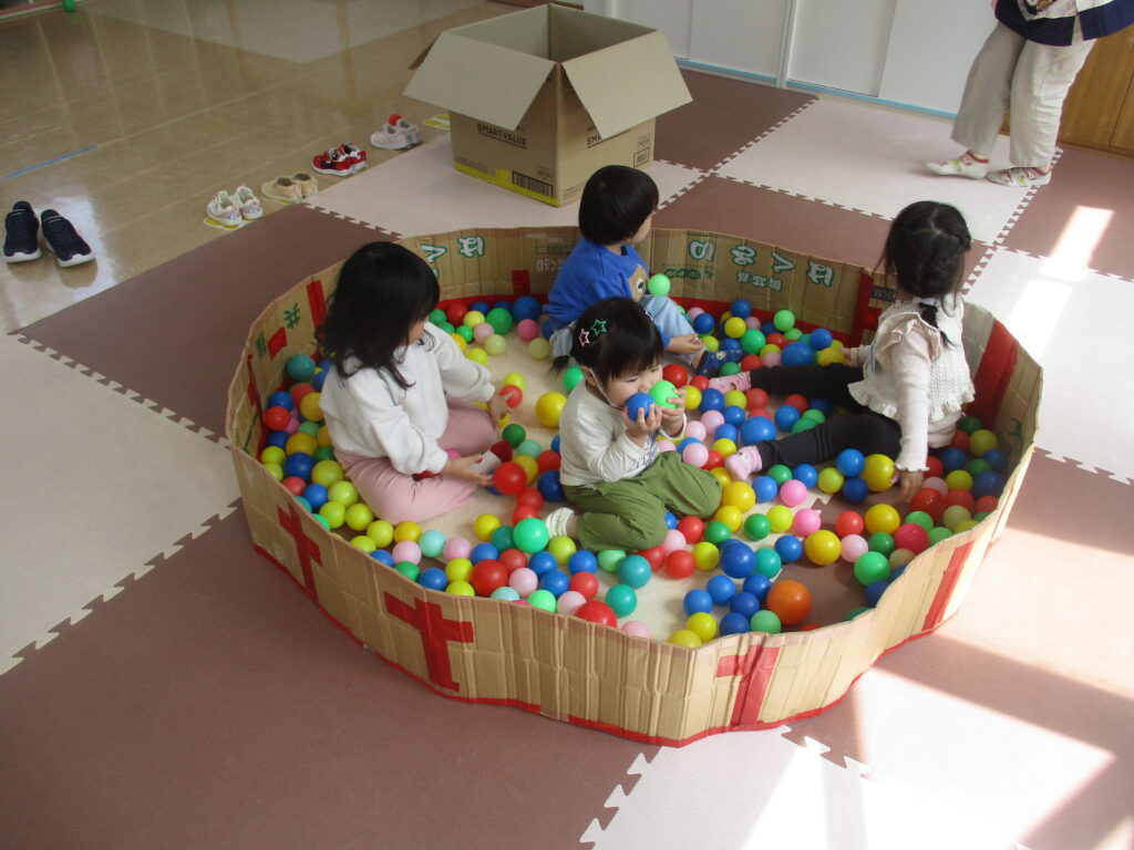 カンガルークラブさんは、ボールプール遊びをしました。ボールを食べ物に見立てて顔につけたり、みんなでボールを水のように掛けるなどをして楽しかったようで笑顔が多い一日でした。