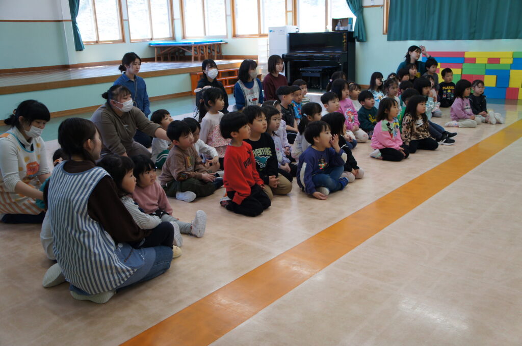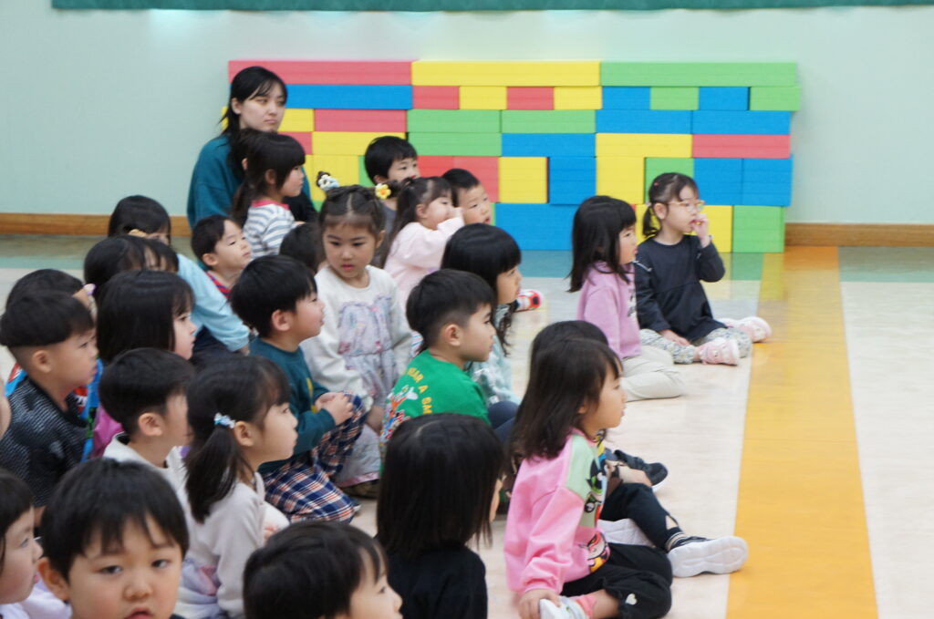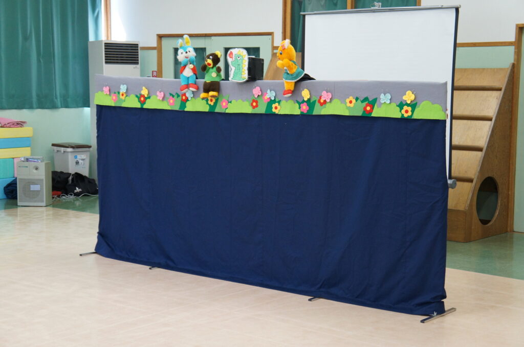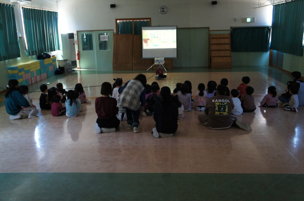 指導員さんからお外で遊ぶ時期なので道路のお約束を確認しようということでぶたさんやうさぎさんなどの動物たちが出てくる人形劇や『はなかっぱの交通安全 〜ケーキを求めて右・左・右〜』のDVDを用意していただきました。子ども達も職員も楽しみながらお約束を確認することができました!