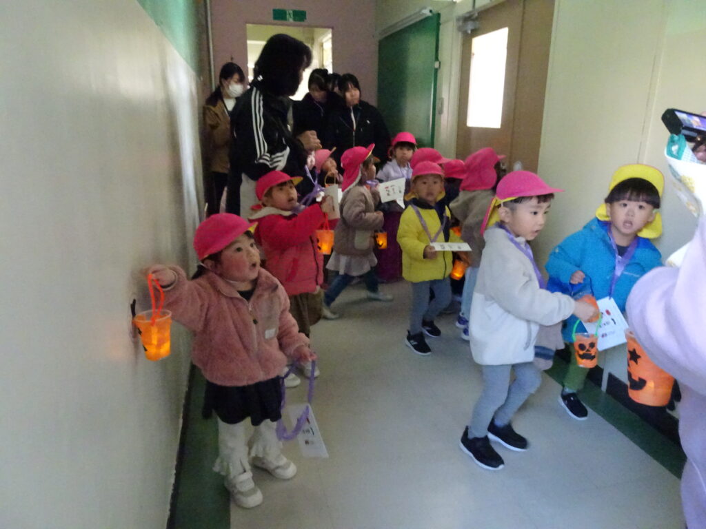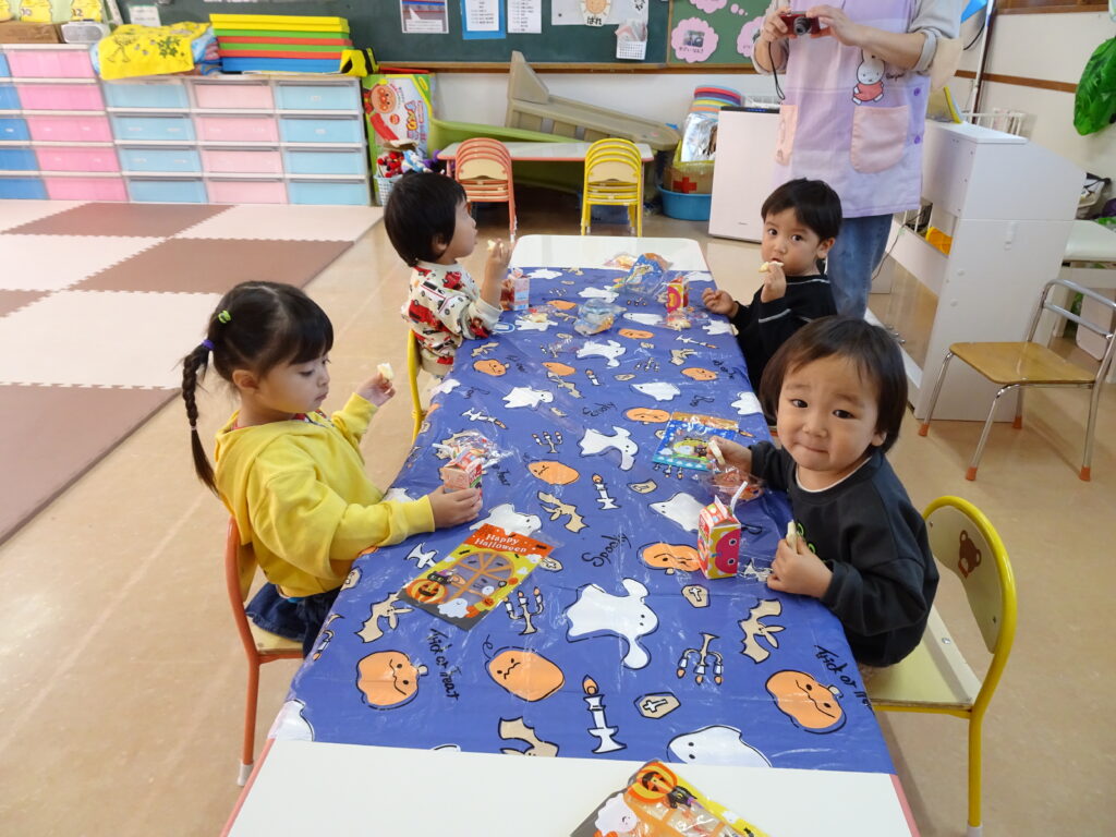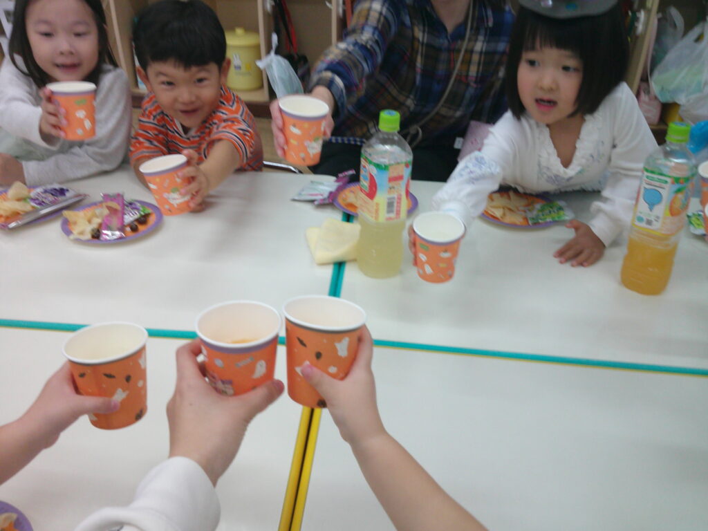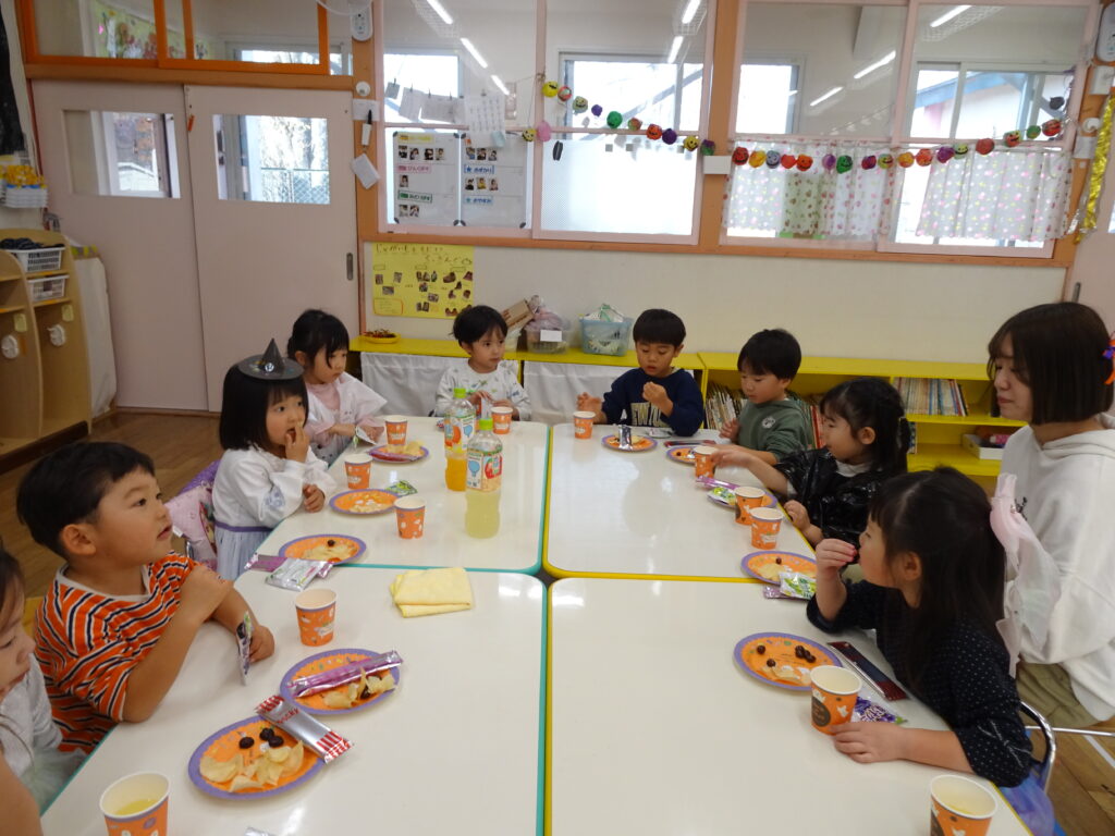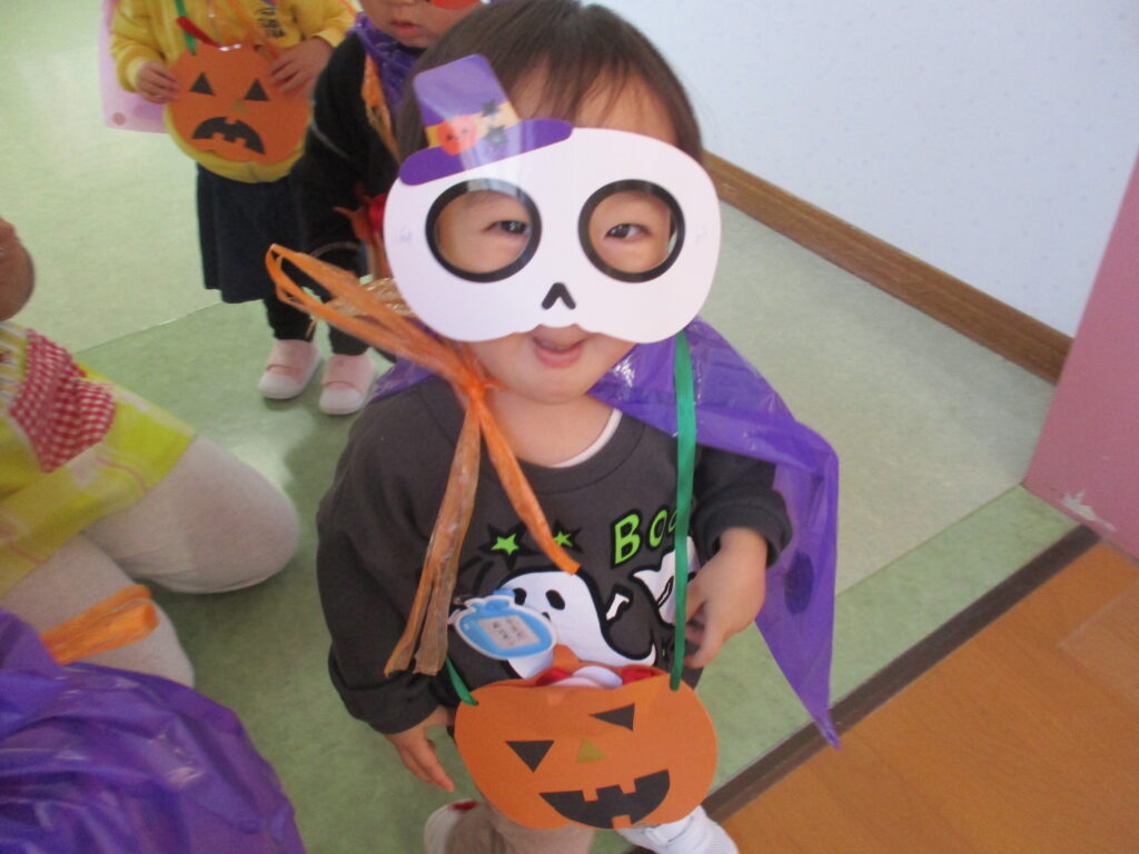 今日の朝は冷え込みましたが、昼間は秋麗でした!昨日はハロウインパーティーをしたきりん組さんはお遊戯会の練習を頑張りました。ご挨拶もとっても上手に出来たそうです。お部屋には「ダルマさんが転んだ」で戻りました。ぱんだ組さんは、ぽこぽこからお手紙が来て、暗号を解いて裏の畑でお菓子を見つけました!自分の選んだ仮装も楽しみました(魔女、雪女、ポケモン、ロボット…)。うさぎ組さんはカボチャのランタンを持って短大を探検して、スタンプラリーもしました。最後に、お菓子を見つけました。カンガルークラブさんもカボチャのバックを作って園舎内でペロペロキャンディーやクッキーを探しました。なんと!?先生の魔法で本物のお菓子に変わりました。三クラスともジュースで乾杯をして、楽しいハロウインパーティーをしました。とっても幸せそうな子ども達でした。