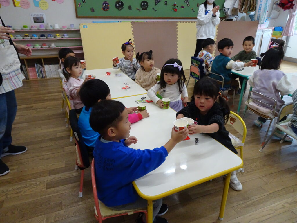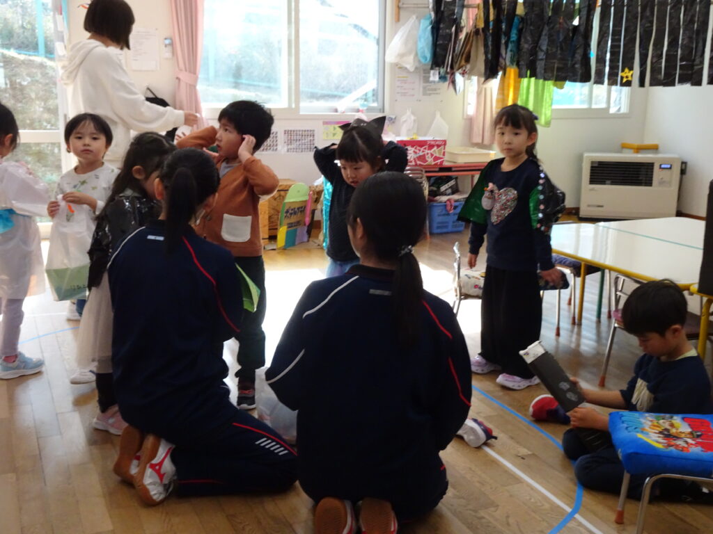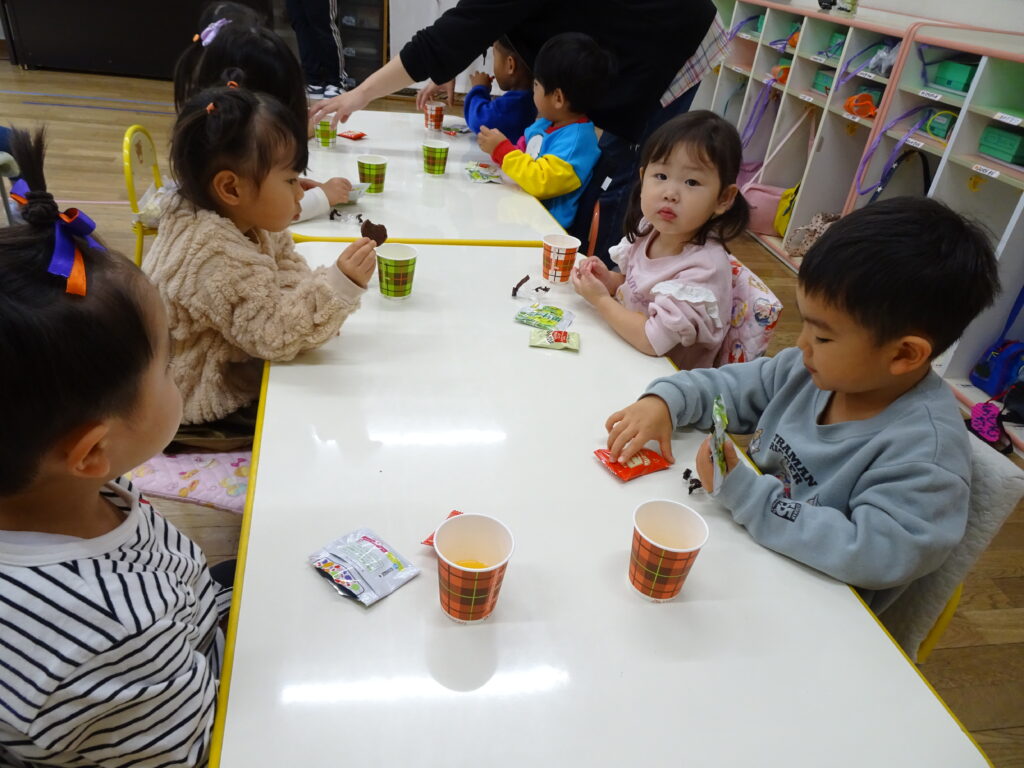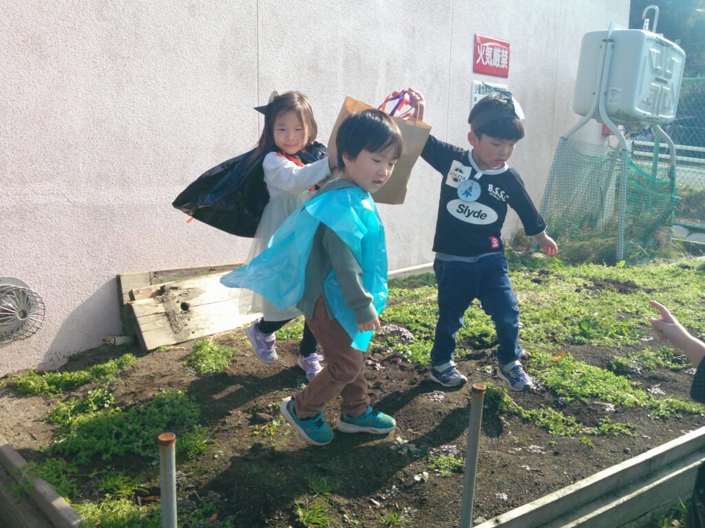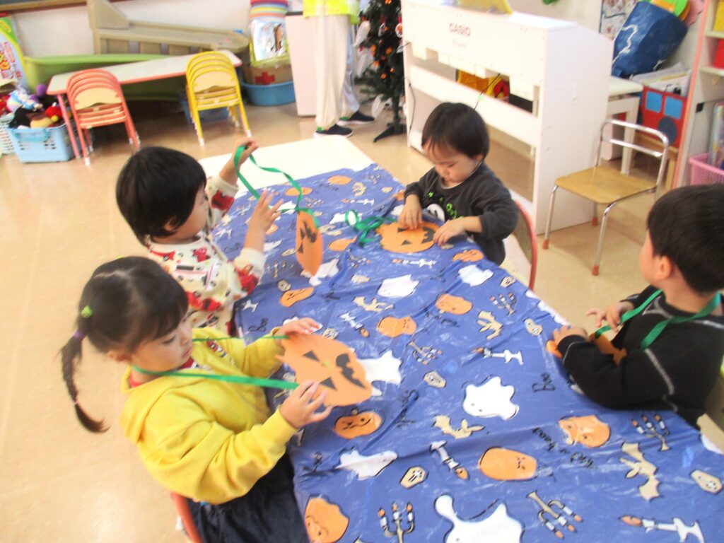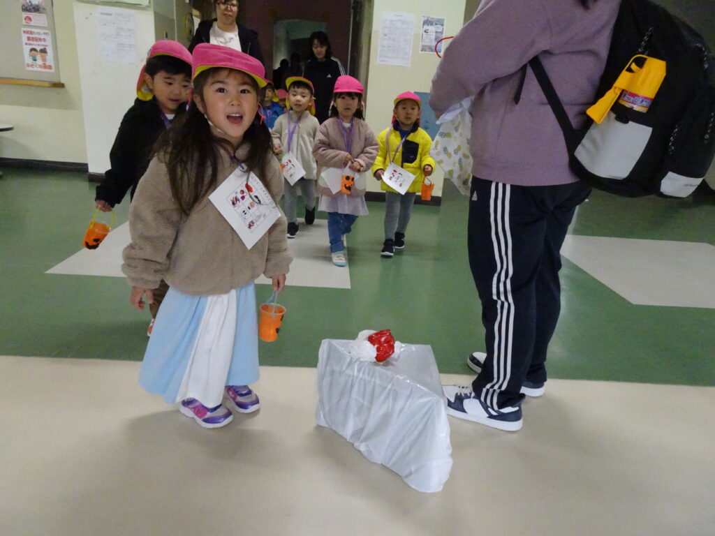 今日の朝は冷え込みましたが、昼間は秋麗でした!昨日はハロウインパーティーをしたきりん組さんはお遊戯会の練習を頑張りました。ご挨拶もとっても上手に出来たそうです。お部屋には「ダルマさんが転んだ」で戻りました。ぱんだ組さんは、ぽこぽこからお手紙が来て、暗号を解いて裏の畑でお菓子を見つけました!自分の選んだ仮装も楽しみました(魔女、雪女、ポケモン、ロボット…)。うさぎ組さんはカボチャのランタンを持って短大を探検して、スタンプラリーもしました。最後に、お菓子を見つけました。カンガルークラブさんもカボチャのバックを作って園舎内でペロペロキャンディーやクッキーを探しました。なんと!?先生の魔法で本物のお菓子に変わりました。三クラスともジュースで乾杯をして、楽しいハロウインパーティーをしました。とっても幸せそうな子ども達でした。