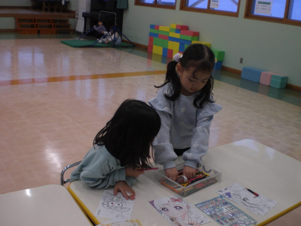 「クリスマスプレゼント貰ったよ。」「お年玉たくさんもらったよ!」子ども達は年末年始の楽しかった思い出いっぱいに登園してきています。3学期は14日(水)から始まります。短い3学期、元気に登園してきてくださいね。今年もよろしくお願いいたします。(森)
